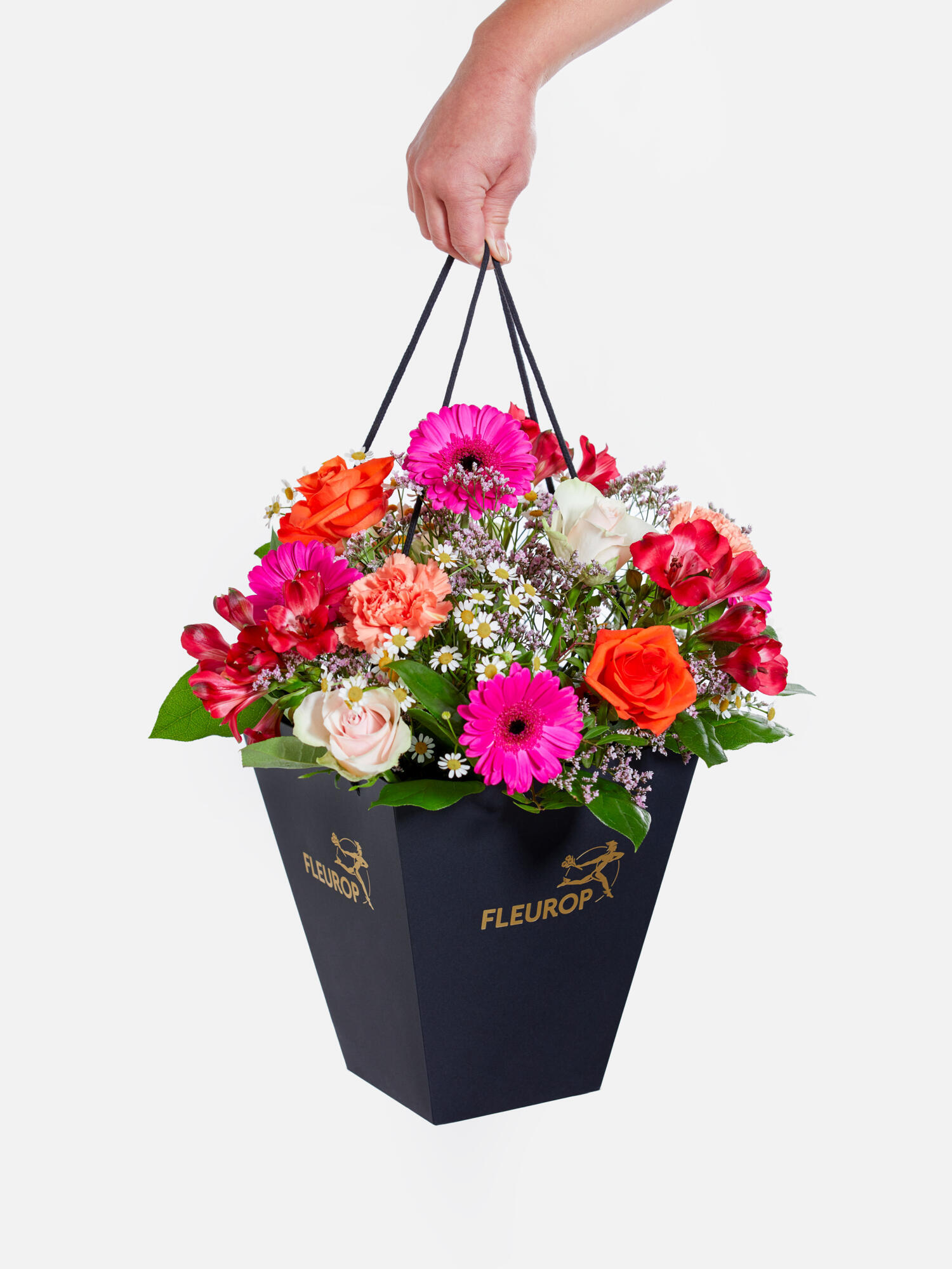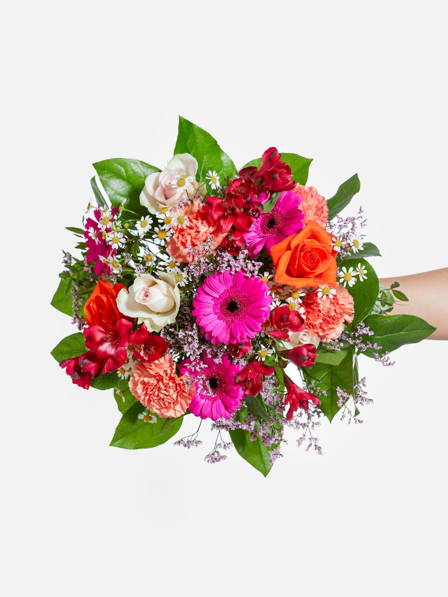 Farbenfroher, locker gebundener Strauß mit Inkalilien (Alstroemeria), Rosen, Nelken, Germini, Kamille und Limonium. Als Beiwerk werden Salal und Pistazie verwendet.