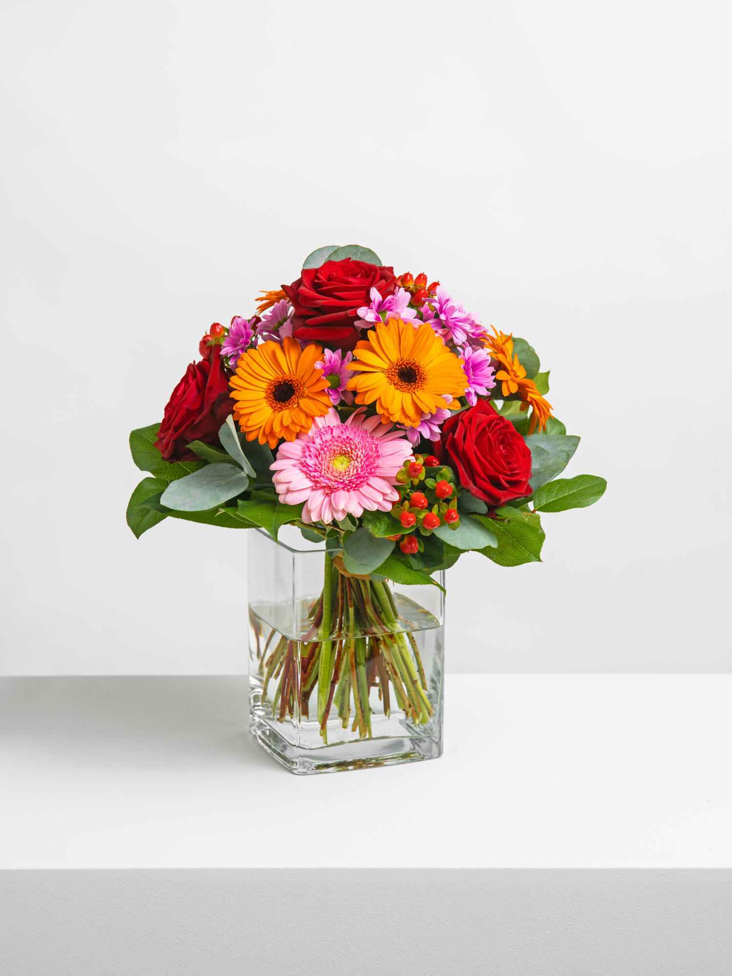 Lieferung innerhalb von 100 Minuten. Bestellbar immer montags bis freitags von 10:00 bis 15:00 Uhr. Überraschen Sie eine besondere Person mit diesem wunderschönen Strauß. Rund gebundener Strauß in Rosa-Orange-Rot mit Rosen, Germini, Santini und Hypericum. Als Beiwerk werden Eukalyptus und Salal verwendet.
