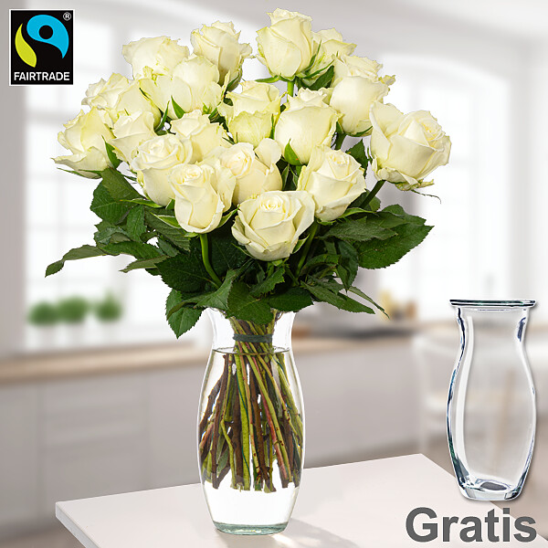 Wunderschönes Rosenpräsent mit 20 weißen Rosen ohne Schnittgrün. Die Rosen sind ca. 40-50 cm lang und haben eine Kopfgröße von ca. 35 cm. Frisch für Dich zusammengestellt mit Pflegetipps Blumennahrung und Wasser versorgt.Mit dem Kauf dieser Fairtrade Rosen leistest Du einen Beitrag zu besseren Arbeits- und Lebensbedingungen für Angestellte auf Rosenfarmen. Durch den Fairen Handel und die Fairtrade-Prämie können diese in eine nachhaltigere Zukunft investieren. Mehr Infos zu Fairtrade. Hersteller:FloraPrima GmbHDidderser Str. 2838176 Wendeburginfo@floraprima.de
