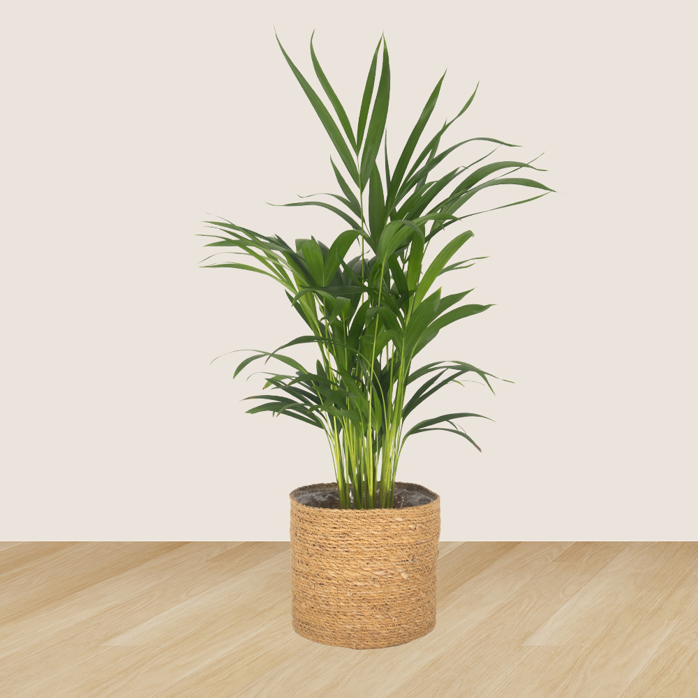 Tropisches Flair im Doppelpack Dieses 2er-Set vereint die elegante Goldfruchtpalme mit dem außergewöhnlichen Goldtüpfelfarn – zwei Pflanzen, die tropisches Lebensgefühl direkt in deine Wohnung bringen. Ob als modernes Deko-Highlight, für mehr Natürlichkeit im Büro oder als Geschenkidee: Mit diesem Set liegst du immer richtig. Die passenden Seegraskörbe sind schon inklusive. Die Goldfruchtpalme begeistert mit ihrem lockeren, federartigen Wuchs und verleiht jedem Raum sofort Leichtigkeit. Kein Wunder, dass sie zu den beliebtesten Zimmerpalmen zählt. Neben ihrem exotischen Aussehen verbessert sie auch das Raumklima. Ideal also für alle, die sich ein frisches Wohngefühl wünschen. Der Goldtüpfelfarn ergänzt das Set perfekt. Mit seinen glänzenden, tiefgrünen Wedeln bringt er eine spannende Struktur ins Grün. Er liebt es hell bis halbschattig und bleibt bei regelmäßiger Wassergabe lange schön. Mit einer Größe von 30–70 cm und einem Topfdurchmesser von 14–17 cm passen beide Pflanzen wunderbar auf Sideboards, Beistelltische oder in eine helle Zimmerecke. Dank der Seegraskörbe bringt dieses Duo direkt tropische Lebendigkeit in jeden Raum.