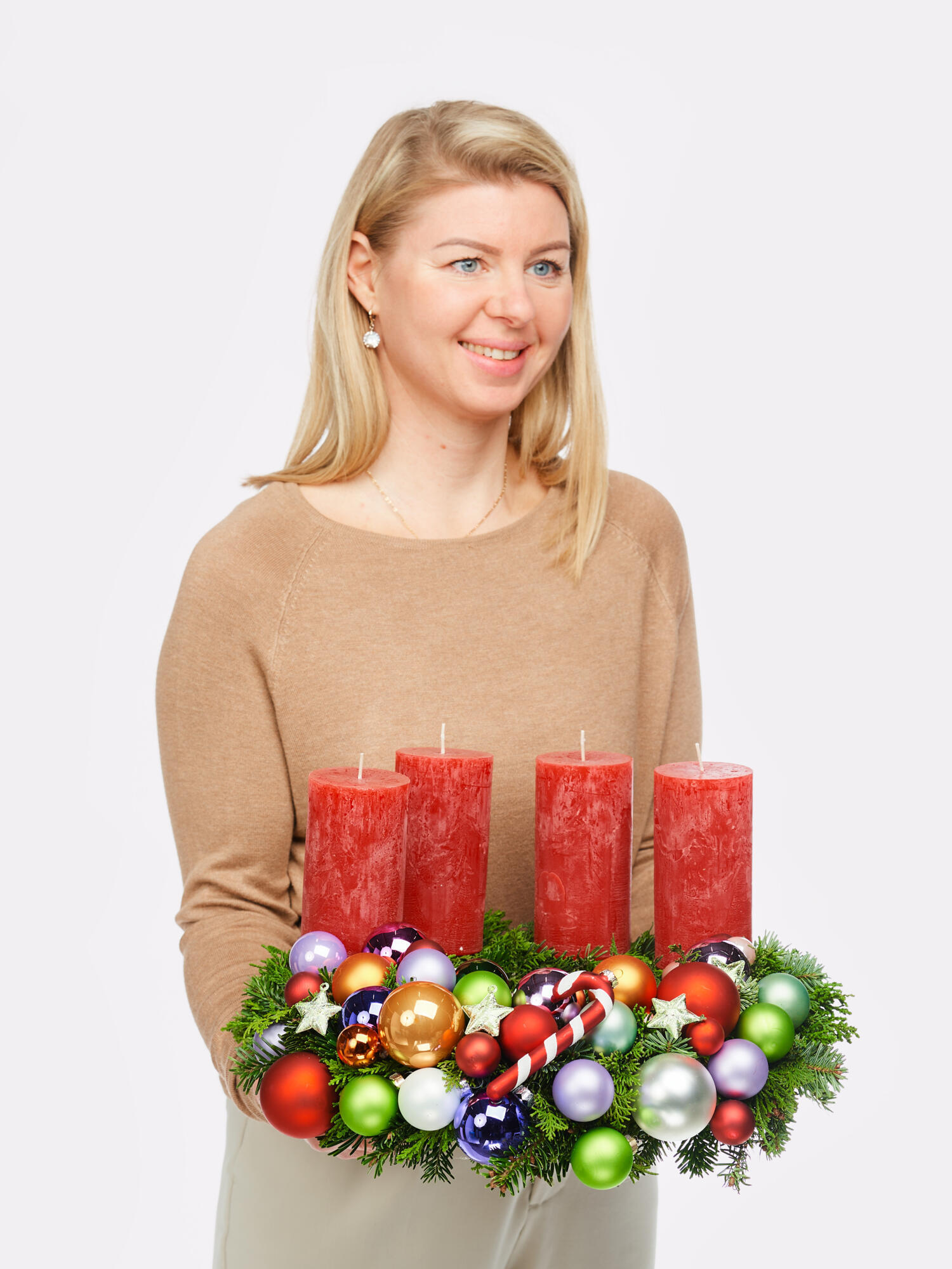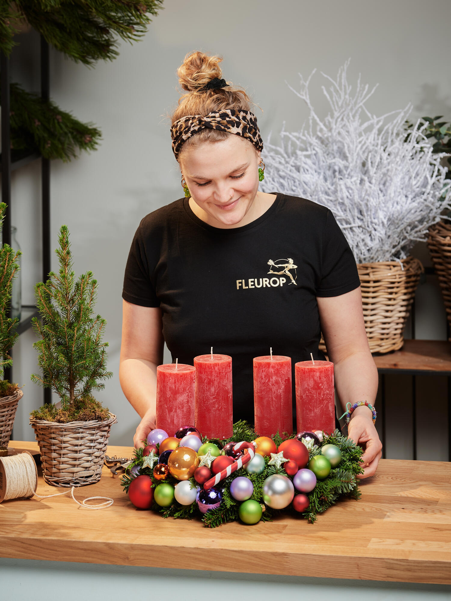 Dieser Adventskranz sorgt für festliche Stimmung! Der Koniferen-Mix mit den vier roten Stumpenkerzen schafft eine warme, einladende Atmosphäre. Die bunten Glaskugeln in Rot, Orange, Silber, Violett, Rosa und Grün bringen viel Leben und Farbe in die Dekoration. Rot-weiße Glaszuckerstangen und grüne Sternanhänger runden das Gesamtbild ab. Mit einem Außendurchmesser von ca. 40 cm ist er ideal für einen Tisch. Ein tolles Highlight, das die Vorfreude auf Weihnachten steigert!