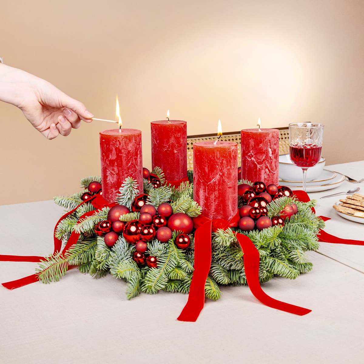 Du liebst Weihnachten im klassischen Stil? Dann solltest du dir unseren Adventskranz Fest der Liebe nicht entgehen lassen. Der festliche Kranz aus edlen Nobilis-Zweigen erreicht einen Durchmesser von etwa 35 cm. Geschmückt ist er mit vier roten Stumpenkerzen mit einer Höhe von ca. 14 cm, roten Zierbändern und kleinen roten Kugeln. Ein zauberhafter Anblick, der Freude bereitet. Die Geschichte des Adventskranzes nahm übrigens in Hamburg ihren Lauf. Im Jahr 1839 hing der evangelisch-lutherische Theologe Johann Hinrich Wichern ein Wagenrad mit vier großen weißen Kerzen und 20 kleinen roten Kerzen an die Decke des Betsaals. Er wollte damit armen Straßenkindern die Zeit bis Weihnachten verkürzen. Seit etwa 1860 wird der Kranz aus Tannengrün gefertigt.