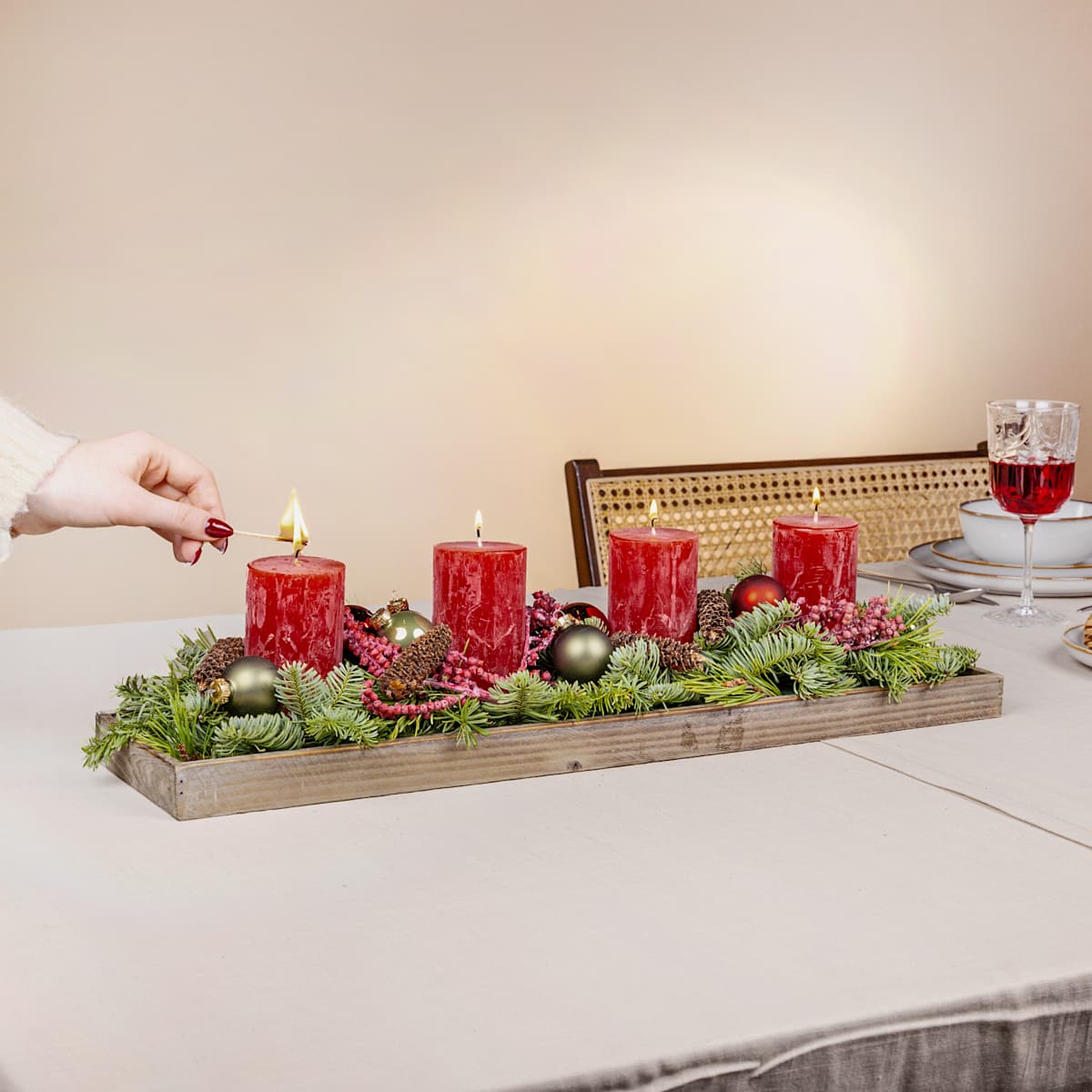 Du bist auf der Suche nach einem Adventskranz, der etwas anders ausfällt? Dann entscheide dich doch für unser Adventsgesteck Vorfreude. Hier trifft der Name wirklich ins Schwarze! Angerichtet auf einem holzfarbenen Tablett enthält es duftendes Tannengrün, festliche Deko und vier klassisch rote Stumpenkerzen, in einer Höhe von ca. 12 cm. Die Länge des Gestecks beträgt etwa 60 cm, die Breite liegt bei ca. 15 cm. Findest du den Namen nicht auch absolut passend? Bei diesem Anblick kann man Weihnachten direkt spüren. Wäre das nicht auch ein schönes Geschenk für deine Lieben? Das flackernde Kerzenlicht verbreitet eine behagliche Atmosphäre und lässt uns den Stress und die Hektik des Alltags vergessen. Freue dich auf Weihnachten!