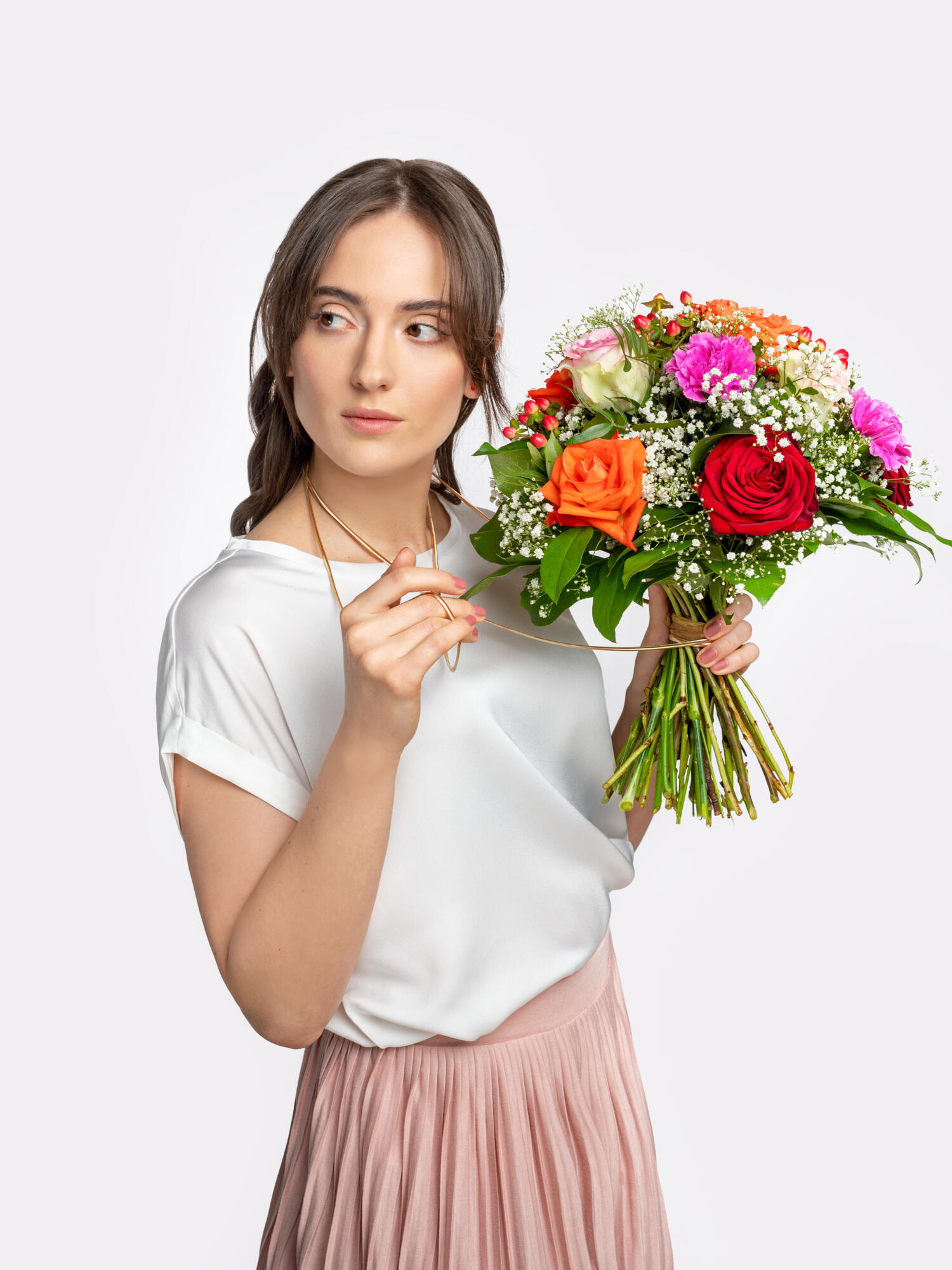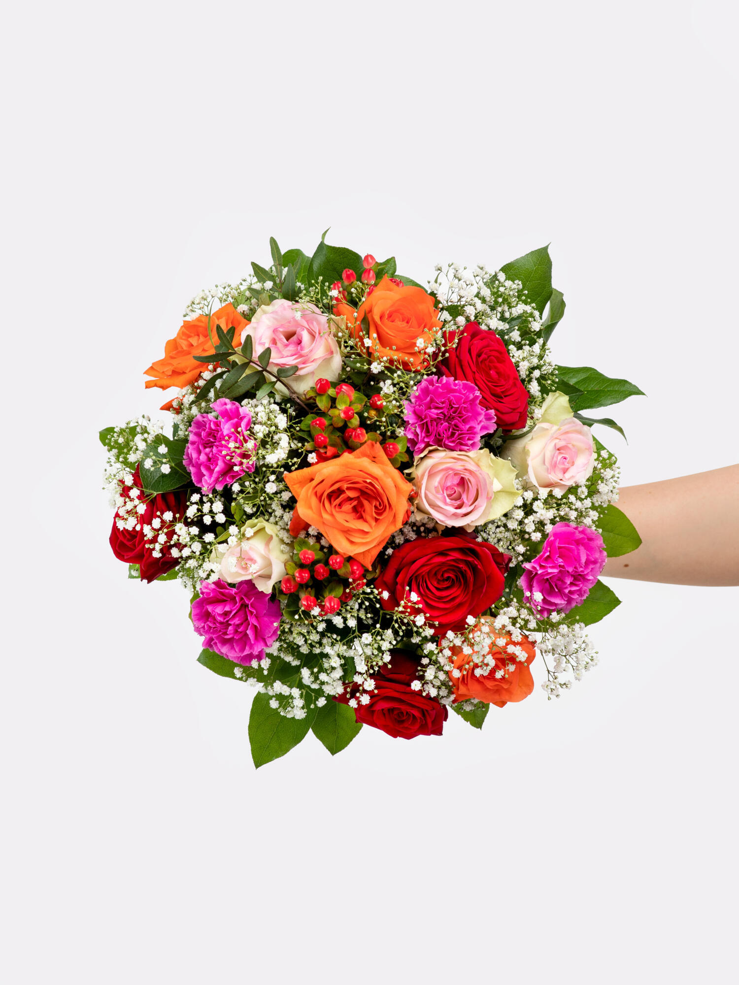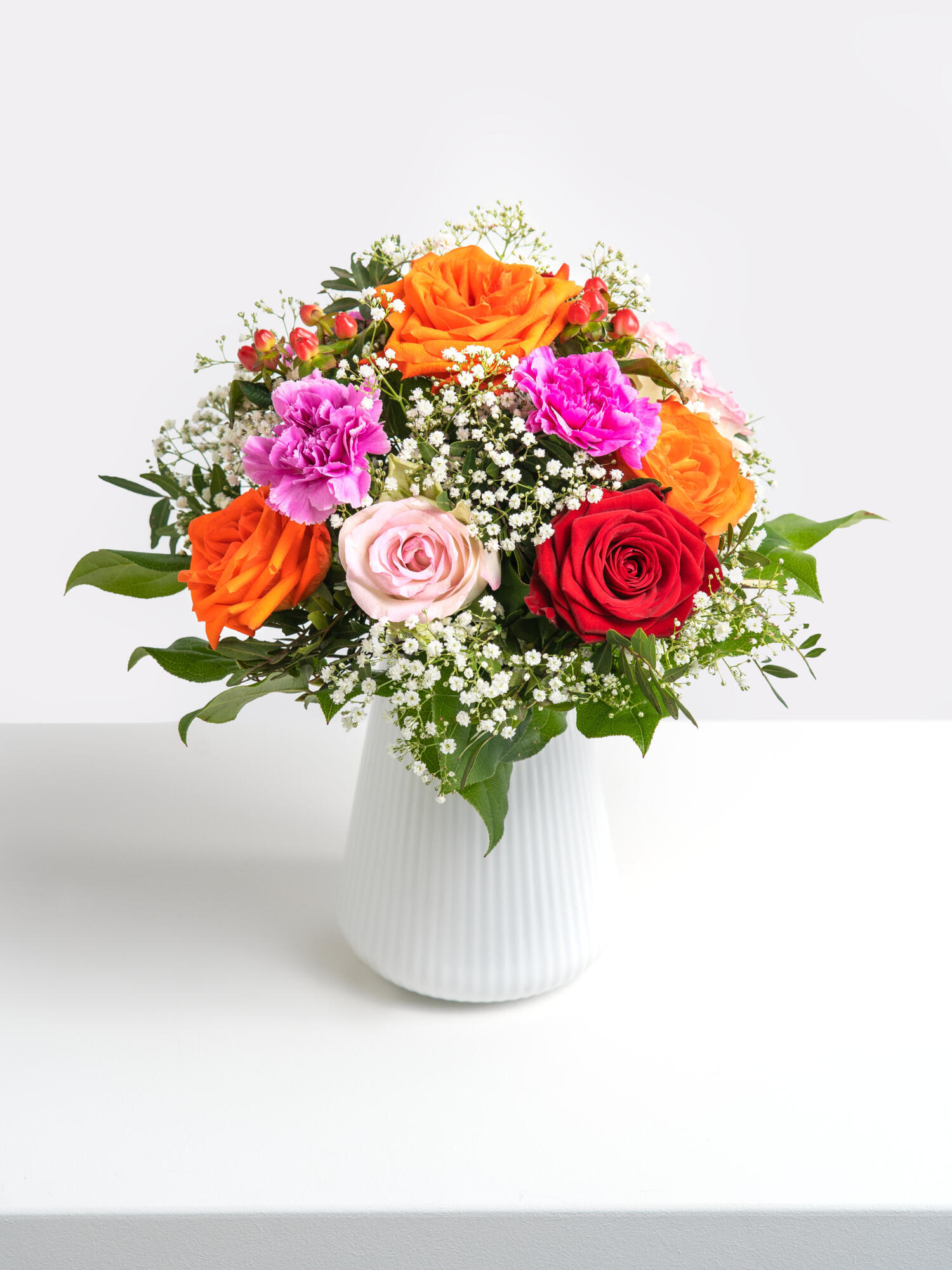 Lieferung innerhalb von 100 Minuten. Bestellbar immer montags bis freitags von 10:00 bis 15:00 Uhr. Liebevoller kann man nicht gratulieren! Sagen Sie mit diesem Strauß „Alles Liebe zum Geburtstag“. Rund gebundener Strauß in Rot-Rosa-Orange mit Rosen, Nelken, Hypericum und Schleierkraut. Als Beiwerk werden Pistazie und Salal verwendet.