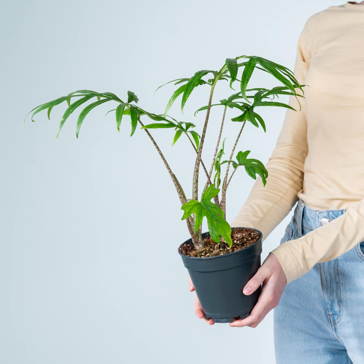Um hier ein Pfeilblatt oder ein Elefantenohr zu sehen, brauchst du schon etwas mehr Fantasie. Also nenn diese wunderbare Pflanze einfach Alokasie ‚Pink Passion‘. Ihre gefleckten Blattstiele haben einen leichten rosa Farbton und ihre tief gebuchteten, herrlich grünen Blätter lassen die Pfeilform noch erahnen. Mit bis zu 1 m Wuchshöhe hat sie auch nicht wirklich Elefanten-Maße, aber es ist genau das, was sie ausmacht. Die Alocasia ‚Pink Passion‘ muss regelmäßig gegossen werden. Wenn du darauf achtest, dass die Erde immer leicht feucht ist, belohnt sie dich mit kräftigem Wuchs. Am besten kann sie das an einem hellen Standort. Die pralle Sonne mag sie nicht so gerne.