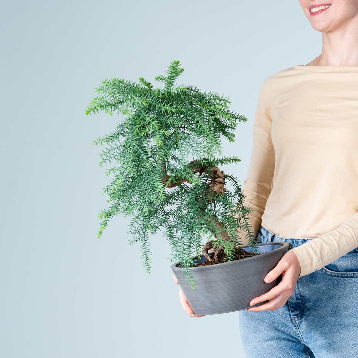 Der Araukaria Bonsai bringt nicht nur seine eigene Steinoptik-Schale mit sich, sondern auch jede Menge Faszination! Du kennst diesen Vertreter der Art Araucaria cunninghamii sicher auch als Andentanne oder Zimmertanne. Zum Bonsai geformt ist er aber noch viel spannender und macht seinem Spitznamen Chilenische Schmucktanne erst so richtig Ehre. Die nadelartigen, dunkelgrünen Blätter unterstreichen dabei den einzigartigen Charakter dieses bis zu 50 cm hoch werdenden Bonsais. Er wächst in einem Natural Eco-pot und kommt an einem hellen Standort, ohne direkte Sonneneinstrahlung, am besten zur Geltung. Du solltest ihn regelmäßig, aber auch nicht zu viel gießen. Ja, er braucht schon etwas mehr Aufmerksamkeit, aber bei der faszinierenden Schönheit gibst du sie ihm garantiert gerne.