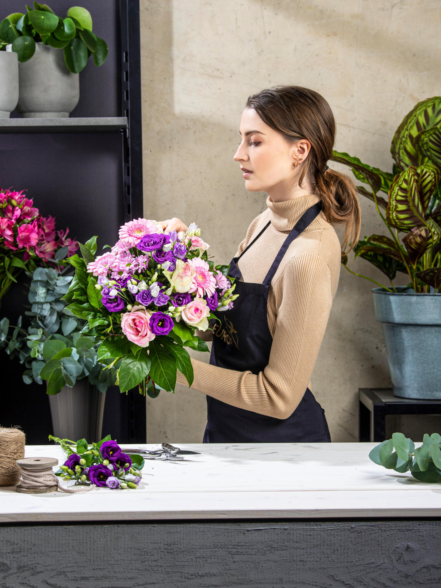 Lieferung innerhalb von 100 Minuten. Bestellbar immer montags bis freitags von 10:00 bis 15:00 Uhr. Zeigen Sie jemanden Ihre Wertschätzung. Rund gebundener Strauß in Rosa-Violett mit Rosen, Germini, Eustoma und Santini. Als Beiwerk werden Pistazie, Aralie und Salal verwendet.