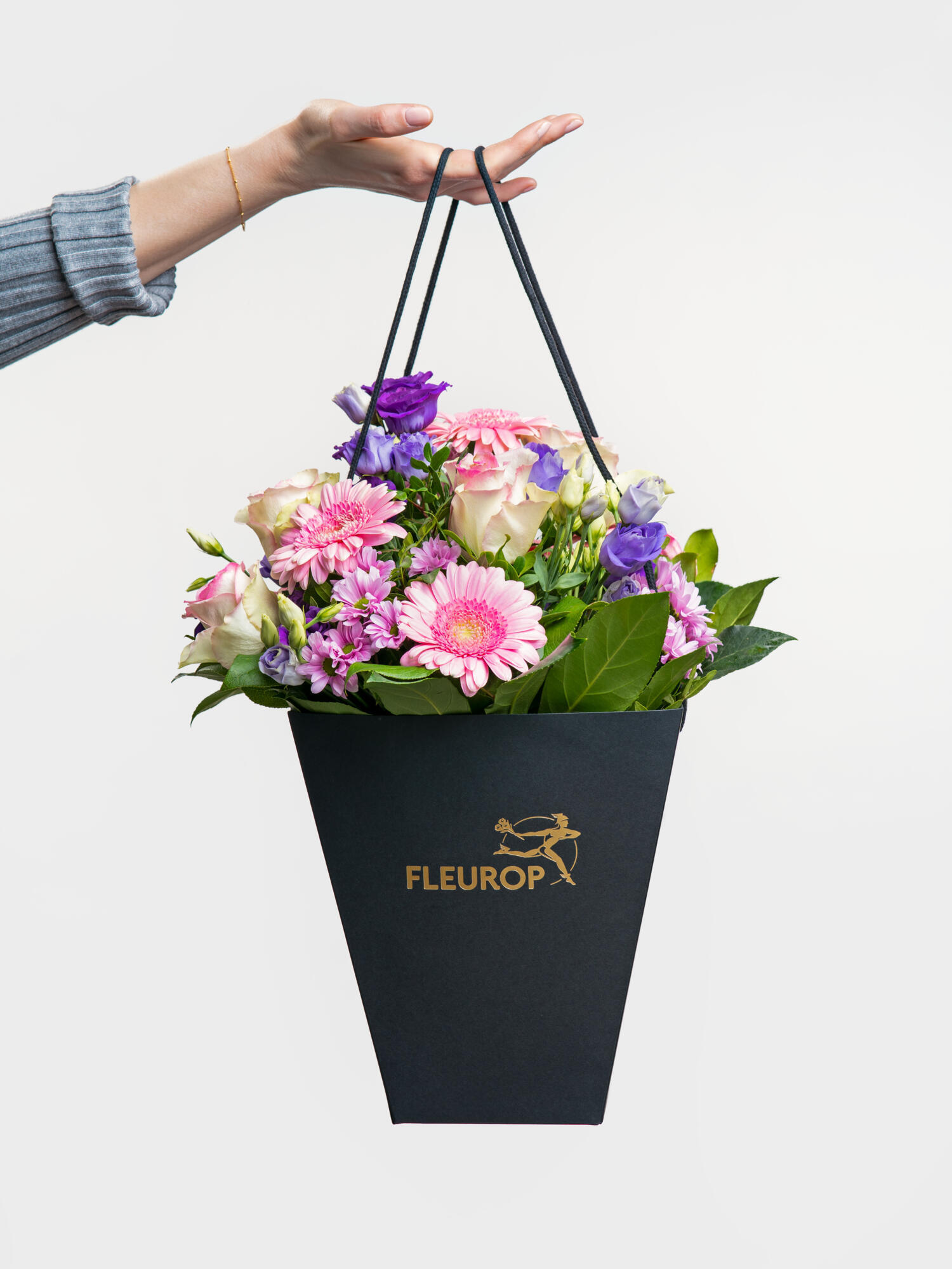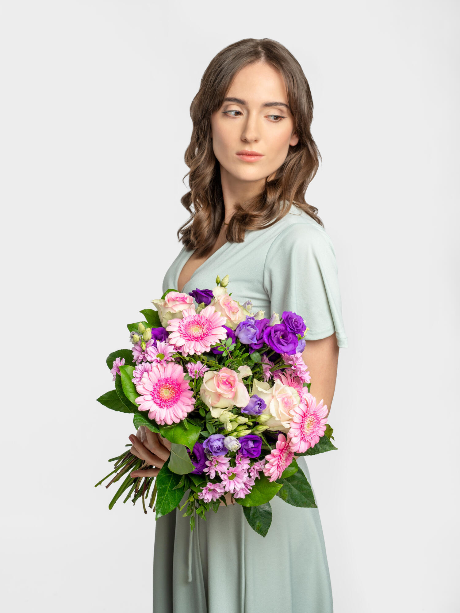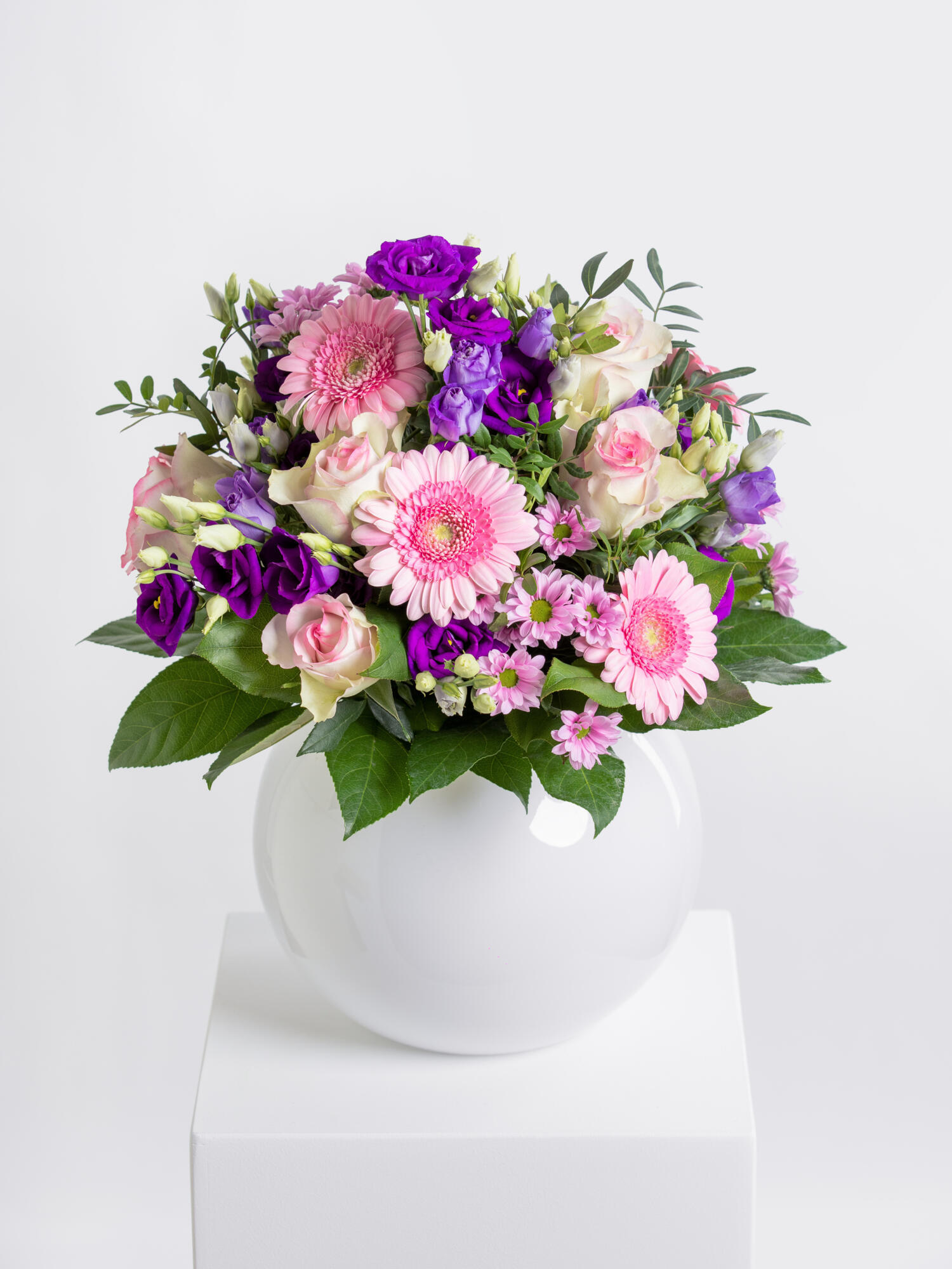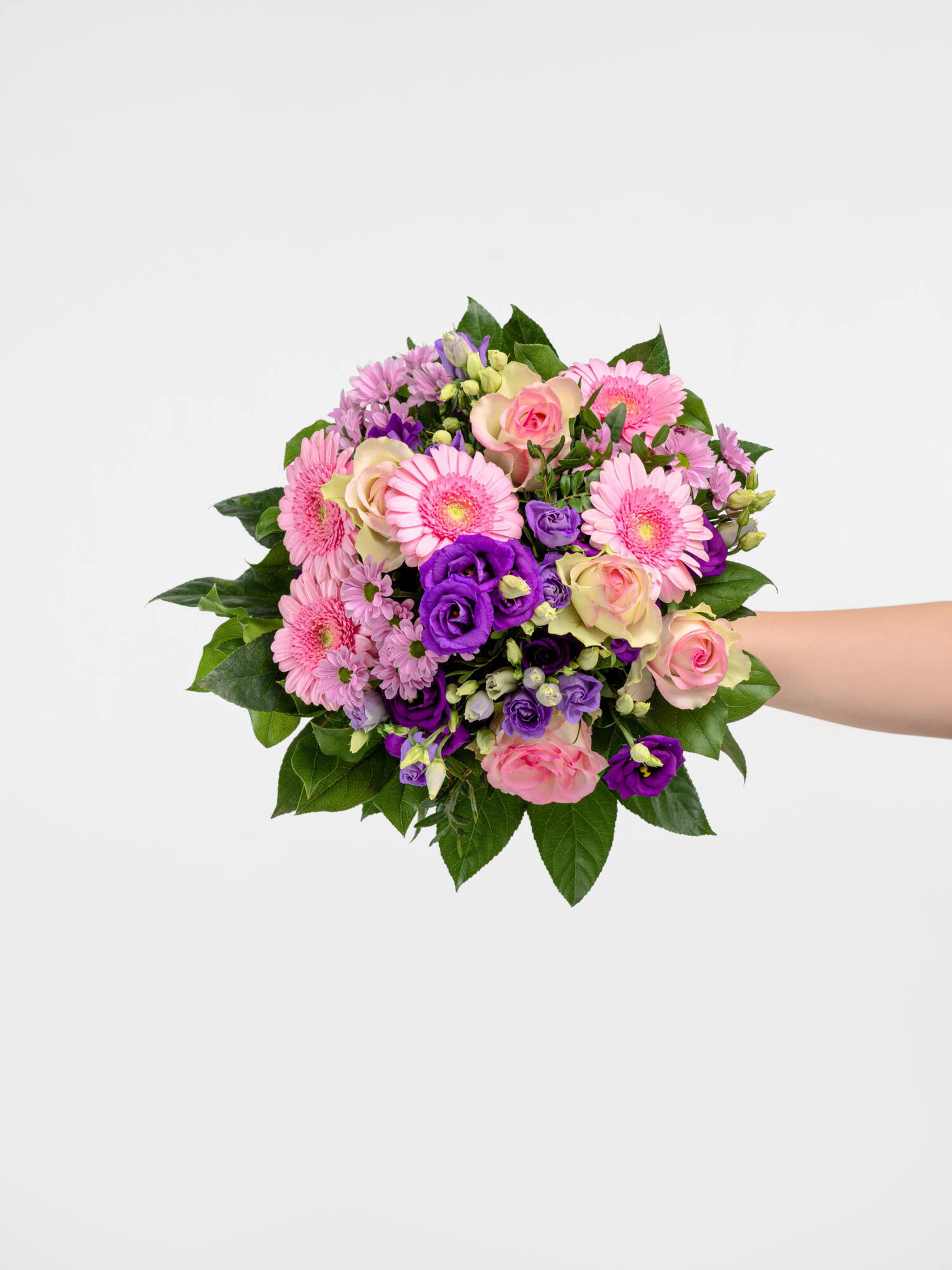 Lieferung innerhalb von 100 Minuten. Bestellbar immer montags bis freitags von 10:00 bis 15:00 Uhr. Zeigen Sie jemanden Ihre Wertschätzung. Rund gebundener Strauß in Rosa-Violett mit Rosen, Germini, Eustoma und Santini. Als Beiwerk werden Pistazie, Aralie und Salal verwendet.