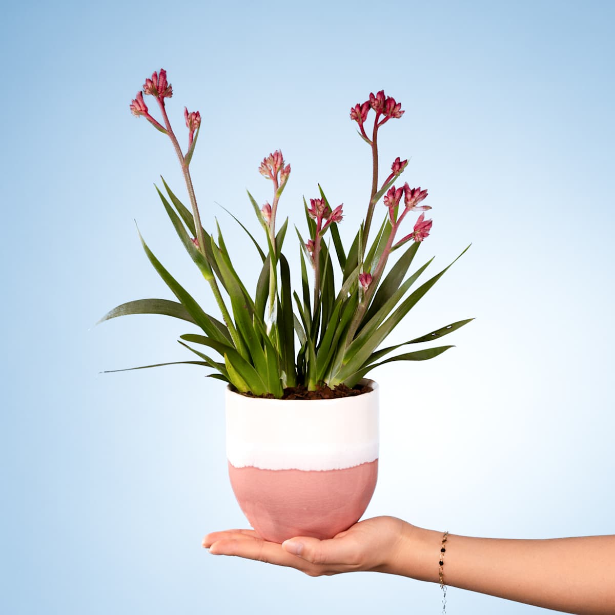 Du suchst einen pflegeleichten Mitbewohner für dich oder deinen Lieblingsmenschen? Dann haben wir etwas ganz Besonderes. Unsere extravagante Kängurupfote Autumn Sangria besticht mit außergewöhnlichen, leicht wolligen Blüten und langen, schmalen Blättern. Die flaumigen Blütenröhren erinnern an die Pfötchen eines Kängurus, daher auch ihr Name. Da sie aus den heißen Regionen Australiens stammt, bevorzugt die Kängurupflanze einen sonnigen Standort und nur mäßige Wassergaben. Hier lautet das Motto: weniger ist mehr. Die hübsche Zimmerpflanze hat eine Topfgröße von 11 cm und eine Wuchshöhe von etwa 40 cm. Geliefert wird sie inklusive Übertopf mit Weiß-Rosa-Verlauf. Diese Rarität solltest du dir keinesfalls entgehen lassen! Ein echter Hingucker mit einzigartigem Charme!