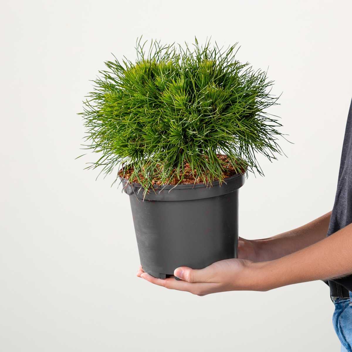 Dieser süße, kleine, blau-grüne Puschel ist eine Bergkiefer und hört auf den Namen ‚Varella‘. Und ja, sie wächst noch. Allerdings wird sie nicht so groß wie ihre Verwandten aus der Art Pinus mugo, auch geht sie mit dem Alter mehr in die Breite, aber bis sie ihre etwa 1,5 m Höhe und 3 m Breite erreicht hat lässt sie sich viel Zeit. Du kannst sie also ganz bequem in Kübel und kleine Beete pflanzen. Übrigens, je älter sie wird, desto höher die Wahrscheinlichkeit, dass sie blüht – in rosarot – und dann braun-gelbe Zapfen entwickelt. Richtig niedlich!Du darfst die Bergkiefer ‚Varella‘ auch mal streicheln und ihr durch die Nadeln wuscheln. Aber ausreichend Wasser und dazu ein sonniger bis halbschattiger Standort, reichen ihr schon um munter zu wachsen.
