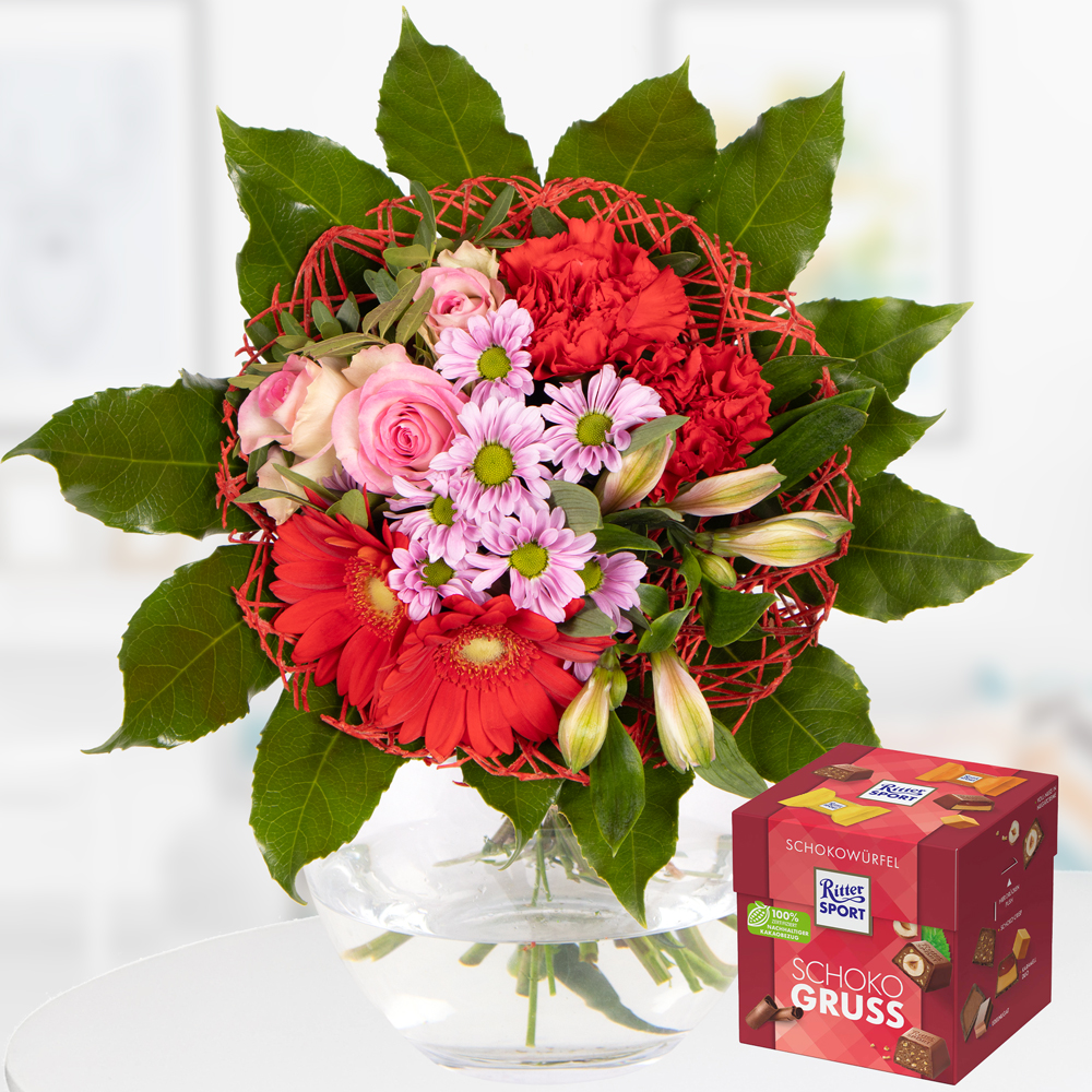 Verführerisches Duo: Rote Eleganz & Schokogruß Lust auf ein Geschenk, das garantiert für strahlende Augen sorgt? Unser Biedermeierstrauß Rote Eleganz und der Schokowürfel Schokogruß von Ritter Sport bilden das perfekte Duo für alle, die Liebe und Genuss vereinen möchten. Unser Biedermeierstrauß Rote Eleganz ist mehr als nur ein Blumenstrauß – er ist eine Liebeserklärung in Form von prachtvollen Rosen, zarten Nelken und fröhlichen Gerbera. Mit seiner lebendigen Farbpalette aus Rot und Rosa zaubert er ein Lächeln auf jedes Gesicht und lässt Herzen höherschlagen. Aber damit nicht genug! Denn zu diesem zauberhaften Strauß gesellt sich der unwiderstehliche Schokowürfel Schokogruß von Ritter Sport. Die kleinen Quadrate verführen mit ihrer zarten Schokolade und knackigen Füllung zu süßen Genussmomenten, die man am liebsten nie enden lassen möchte. Lieferumfang: * Biedermeierstrauß Rote Eleganz (https://www.blumenshop.de/biedermeierstrauss-rote-eleganz.html) * Ritter Sport Schokowürfel Schokogruß (https://www.blumenshop.de/ritter-sport-schokowurfel-schokogruss.html)