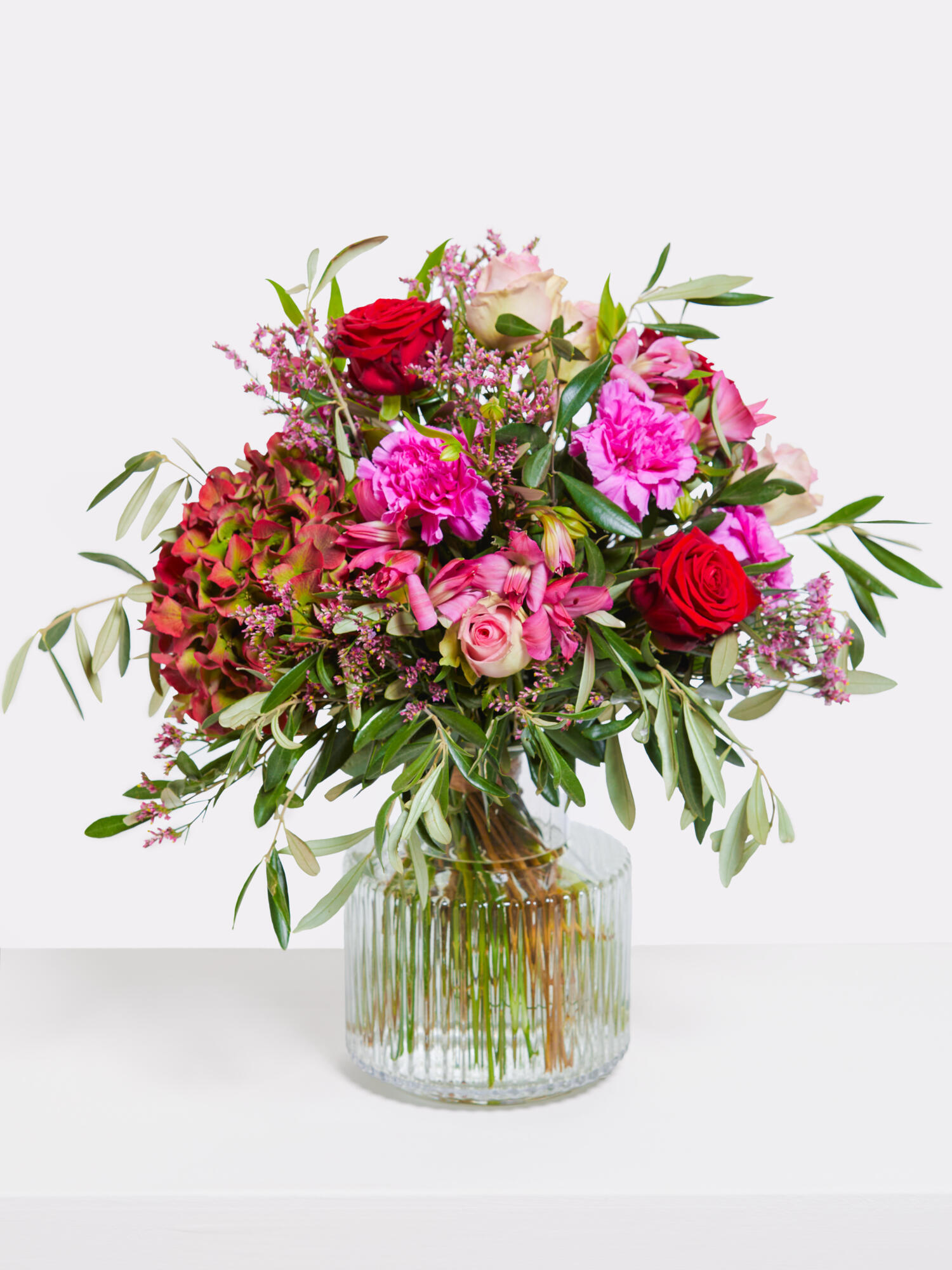 Kompakt gebundener Strauß in Rosa-Pink-Rot mit Rosen, Hortensien, Nelken, Inkalilien (Alstroemeria) und Strandflieder. Als Beiwerk wird Olive verwendet.