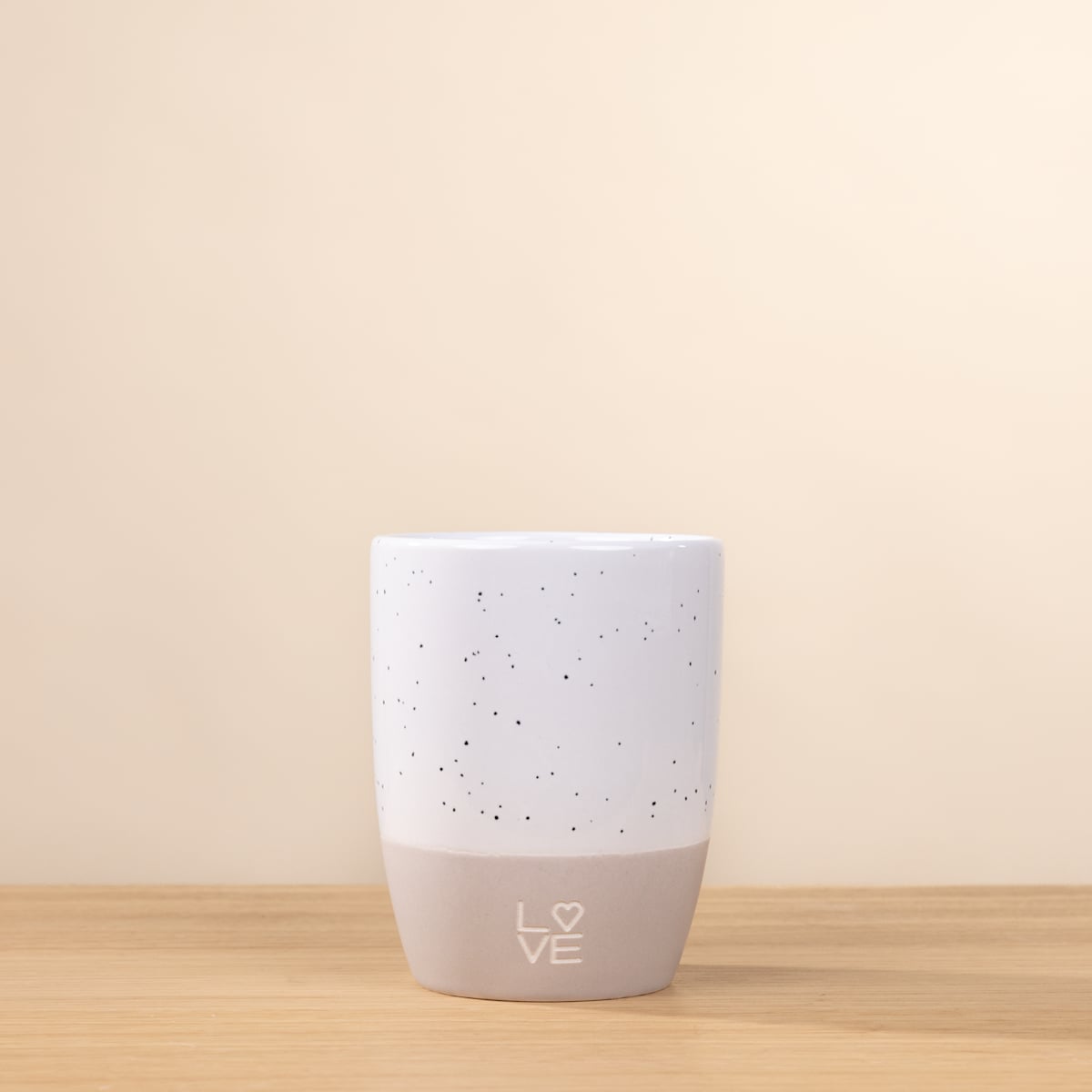 Du bist auf der Suche nach einem hübschen Becher für deinen Kaffee, Kakao oder Tee? Da haben wir genau das Richtige für dich. Unser „Blume-Becher“ ist lebensmittelecht und spülmaschinenfest. Und das Beste: Er wird exklusiv bei Blume2000 angeboten. Im oberen Bereich ist der Becher glasiert und mit kleinen schwarzen Sprenkeln versehen. Weiter unten präsentiert er sich matt/rau mit angenehmer Haptik. Hier befindet sich auch die dekorative Prägung, die dem Becher in Weiß das gewisse Etwas verleiht. Mit einer Höhe von 10,5 cm und einem Durchmesser von 8,5 cm eignet er sich perfekt für deine heißen Getränke. Also nicht lange warten, sondern ganz schnell zugreifen.