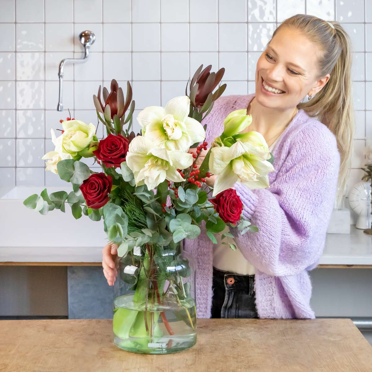 Mit unser zauberhaften Blumenbox Christmas Fairy zauberst du im Handumdrehen eine Atmosphäre voller Eleganz und Natürlichkeit. Diese exklusive Auswahl an Blumen, darunter majestätische Amaryllis, festliches Ilex, exotische Protea, zarte Rosen, duftender Eukalyptus und frisches Kieferngrün, vereint sich zu einem atemberaubenden Arrangement. Mit einer Stiellänge von 50 cm, die individuell angepasst werden kann, passt sich die Blumenbox perfekt jedem Raum an. Ob als Geschenk für die Liebsten oder als eigenes Highlight im Zuhause – dieses Arrangement verströmt Schönheit und Charme. Lass dich von der Magie der Blumen verzaubern und erlebe die zeitlose Eleganz von unserer Blumenbox Stella.