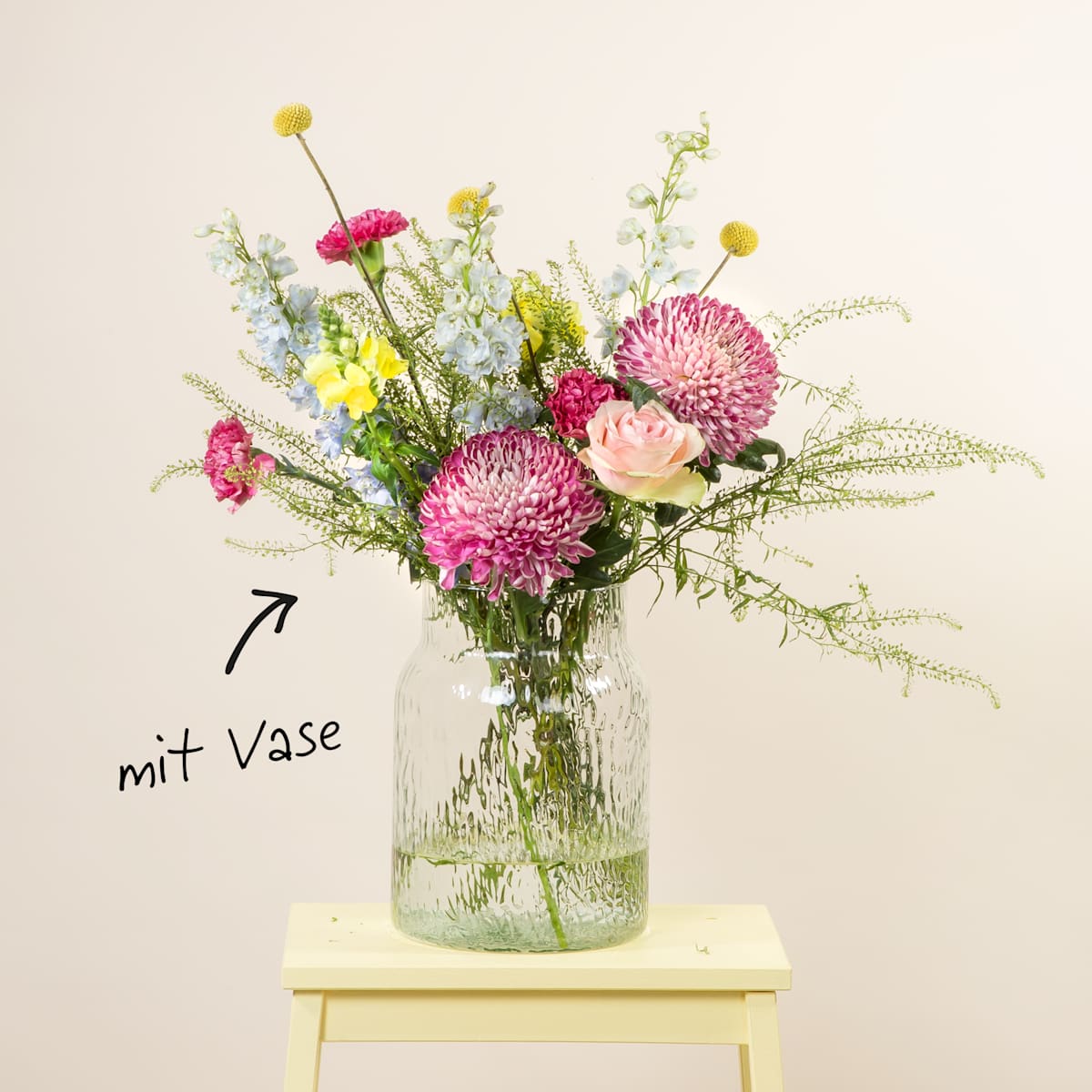 Verschenke mit der Blumenbox Sweet Delight einen wunderschönen Blumengruß zum Selbstgestalten. Der einladende Strauß mit einer Stiellänge von 50 cm besteht aus Nelken, Chrysanthemen, Craspedia, Rittersporn, Rosen und Thlaspi. Rittersporn in seinen leuchtenden Farben dürfte wohl die exklusivste Schnittblume sein, die es gibt. Die langen und schlanken Stiele sind mit vielen farbintensiven Blüten besetzt. Leuchtend gelb präsentiert sich die kugelförmige Craspedia. Ihre besondere Form verlieh ihr auch die Bezeichnung Trommelstöcke. Sie erzeugt kontrastvolle Spannungen, wenn sie mit dunklen Blumensorten kombiniert wird. Edle Rosen und farbenfrohe Nelken runden das zauberhafte Arrangement ab. Die passende Vase, designed by BLUME2000, ist ebenfalls im Lieferumfang enthalten. Das hübsche Exemplar ist mundgeblasen und aus 100 Prozent Recycling-Glas gefertigt. Somit leistest du noch einen Beitrag zum Umweltschutz. Produziert wurde sie in Europa. Die Vase ist etwa 26,5 cm hoch und hat an der breitesten Stelle einen Durchmesser von ca. 19 cm. So schön kann es sein, ein Dankeschön zu verschenken.