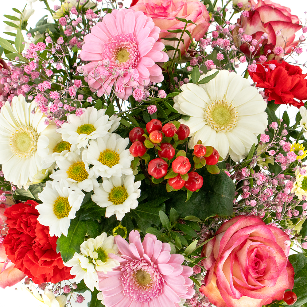 Blumen fürs Herz Unser Blumenstrauß Alina soll Freude bringen und ist dank seinen roten Nelken, zweifarbigen Rosen und niedlichen Santini genau der richtige Strauß für einen lieben Menschen. Mit diesem Strauß triffst du zu vielen Anlässen die richtige Wahl. Zweifarbige Rosen sind das Highlight in diesem romantisch fröhlichen Blumenstrauß. Gerbera und rosafarbenes Schleierkraut lockern den Strauß auf und getoppt wird das Ganze durch eine Vielzahl weiterer angesagter Blumen. Zweifarbige Rosen kann man übrigens ohne romantische Hintergründe an gute Freunde verschenken, denn sie stehen für Wertschätzung und Freundschaft. Kombiniere zu dem Blumenstrauß eine leckere Schokolade oder eine hochwertige Tasse mit einem passenden Spruch und dein Empfänger wird diese Überraschung so schnell nicht vergessen. Unser Tipp: Lade nach der Bestellung eine persönliche Videobotschaft hoch. Diese wird gemeinsam mit den Blumen via QR-Code übergeben und zusätzlich für große Augen sorgen. Egal ob zum Jahrestag, Geburtstag oder als Dankeschön. Dieser Blumenstrauß sorgt für gute Laune und das nachhaltig. Denn überraschend einen Blumenstrauß zu erhalten, tut der Seele gut. Einfach mal ausprobieren!