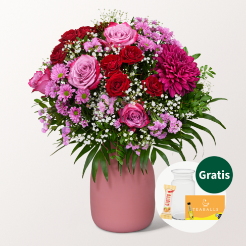 Eine elegante und zugleich ausdrucksstarke Komposition in Rosa- und Rottönen. Pinke Rosen rote Sprayrosen und rosafarbene Santini werden durch eine brombeerfarbene Dekochrysantheme und rosa Statice ergänzt. Begleitet wird das Arrangement von weißem Schleierkraut Pistochia und Chico Jumbo. Durchmesser ca. 40 cm. Frisch für Dich zusammengestellt mit Pflegetipps Blumennahrung und Wasser versorgt. Hersteller:FloraPrima GmbHDidderser Str. 2838176 Wendeburginfo@floraprima.de