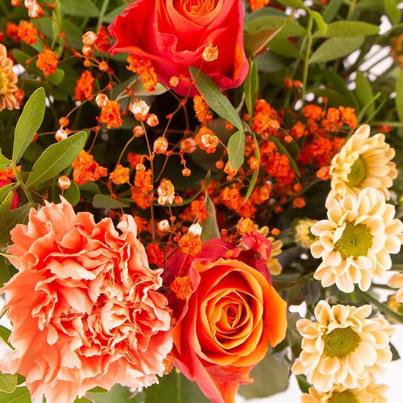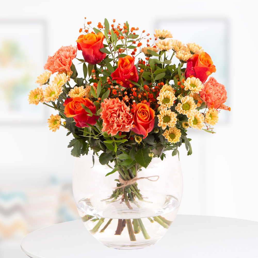Warme Farben bringen gute Laune Der Blumenstrauß Blumenzauber ist mit seinen leuchtenen Orangetönen ein Blickfang in jedem Raum. Egal ob du dein Wohnzimmer oder den Eingangsbereich mit ein wenig Farbe erweitern möchtest. Schon gewusst? Frische Blumen sorgen für gute Laune und bringen Freude. Gibt es einen besonderen Menschen, dem du Freude schenken möchtest? Zarte Santini, strahlende Rosen und feurige Nelken sorgen für ein Blütenmeer, während Schleierkraut und Pistaziengrün den Blumenstrauß auflockern. Die Blumen haben eine Stiellänge von ca. 40 cm. Der Strauß wird aus den beliebtesten Blumen sorgfältig von Hand gebunden und eignet sich hervorragend als unverfängliches Geschenk oder liebes Mitbringsel. Mit unserer kostenlosen Grußkarte oder einer Videobotschaft wird deine Überraschung zum einmaligen Geschenk für gute Freunde, liebe Kollegen oder die Familie. Blumen sind ein emotionales und großartiges Geschenk, besonders zum Geburtstag oder Jahrestag. Unser Blumenstrauß Blumenzauber wird frisch von Hand gebunden und bringt dir so die wärmsten Farben in dein Zuhause oder in das Heim eines besonderen Menschen.