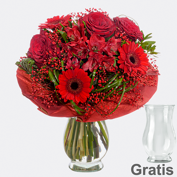 Einzigartiger Valentinstagsstrauß mit roten Rosen Monte Carlo roter Alstromeria roten Germini rotem Schleierkraut Gräsern und Pistochia in einer roten Manschette. Durchmesser ca. 30 cm. Frisch für Dich zusammengestellt mit Pflegetipps Blumennahrung und Wasser versorgt. Hersteller:FloraPrima GmbHDidderser Str. 2838176 Wendeburginfo@floraprima.de
