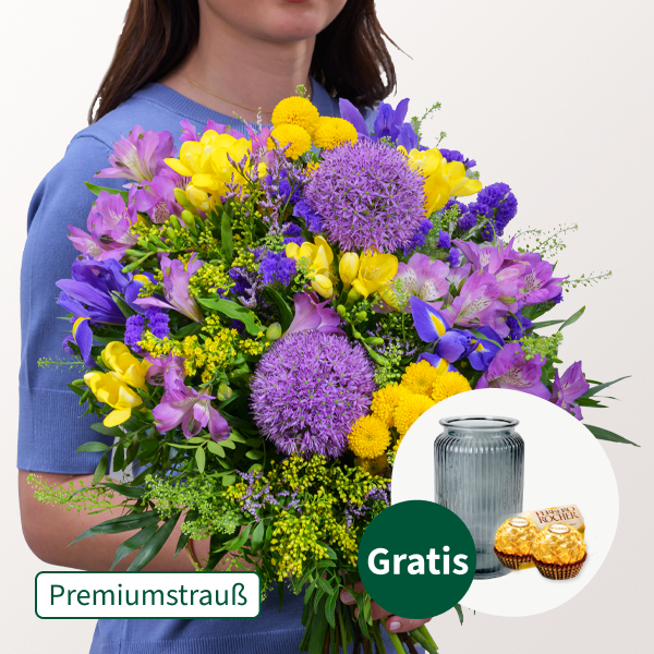 Großartiger Blumenstrauß mit gelben Santiniballs blauen Allium fliederfarbenem Limonium blauen Statice Solidago fliederfarbenen Alstromerie gelben Freesien blauen Iris Thlaspi Chico Jumbo und Pistochia. Durchmesser ca. 40 cm. Frisch für Dich zusammengestellt mit Pflegetipps Blumennahrung und Wasser versorgt.Hinweis: Die Freesien kommen im frischen und unaufgeblühten Zustand. Sie öffnen sich später je nach Standort und Temperatur. Hersteller:FloraPrima GmbHDidderser Str. 2838176 Wendeburginfo@floraprima.de