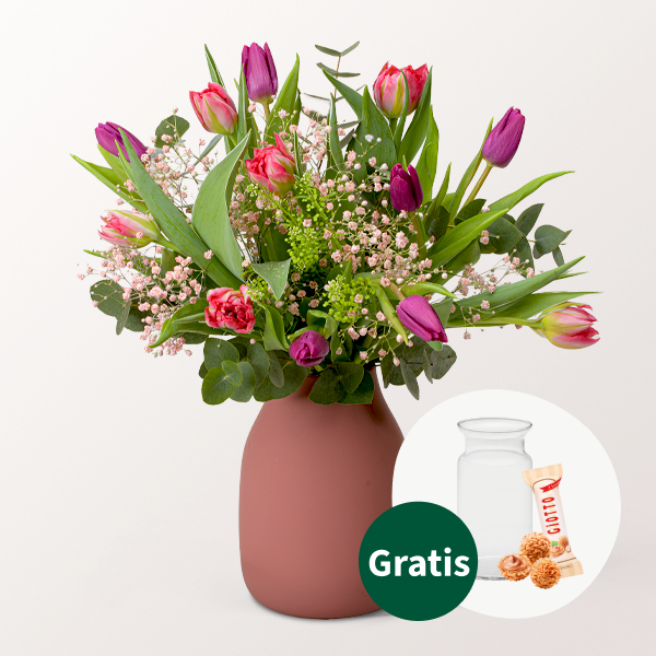 Zauberhafte Mischung aus rosa und lilafarbenen Tulpen hellrosa Schleierkraut Thlaspi und Eukalyptus. Durchmesser ca. 25-30 cm. Frisch für Dich zusammengestellt mit Pflegetipps Blumennahrung und Wasser versorgt.Hinweis: Die abgebildete Vase gehört nicht zum Lieferumfang.Hersteller:FloraPrima GmbHDidderser Str. 2838176 Wendeburginfo@floraprima.de