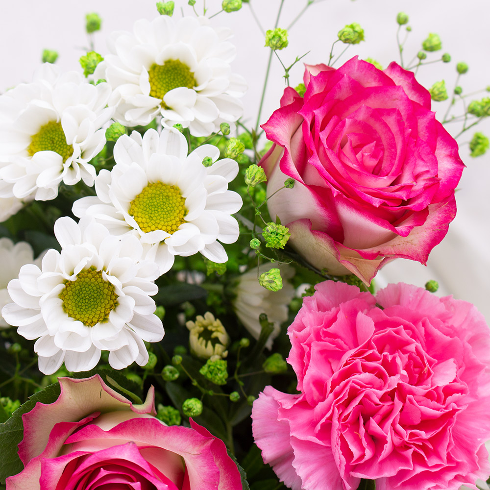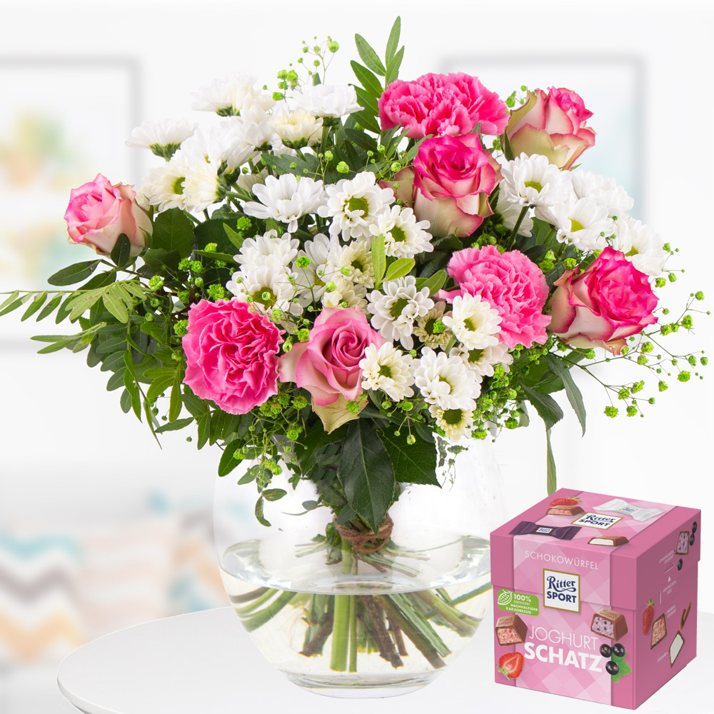 Blumen, nur für dich mit leckerer Schokolade! Der Blumenstrauß Glückskind mit leckerer Ritter Sport Joghurt-Mix Schokolade im „Joghurtschatz“-Design als schönes Geschenk. Der Strauß besteht aus Rosen in Creme und Rosé und weißen Santini. Pinke Nelken, trendiges Pistaziengrün und Schleierkraut runden den Strauß ab. Die Stiellänge der Blumen beträgt ca. 35 cm. Lieferumfang: * Blumenstrauß Glückskind (https://www.blumenshop.de/blumenstrauss-glueckskind.html) * Ritter Sport Schokowürfel Joghurtschatz (https://www.blumenshop.de/ritter-sport-schokowurfel-joghurt.html)