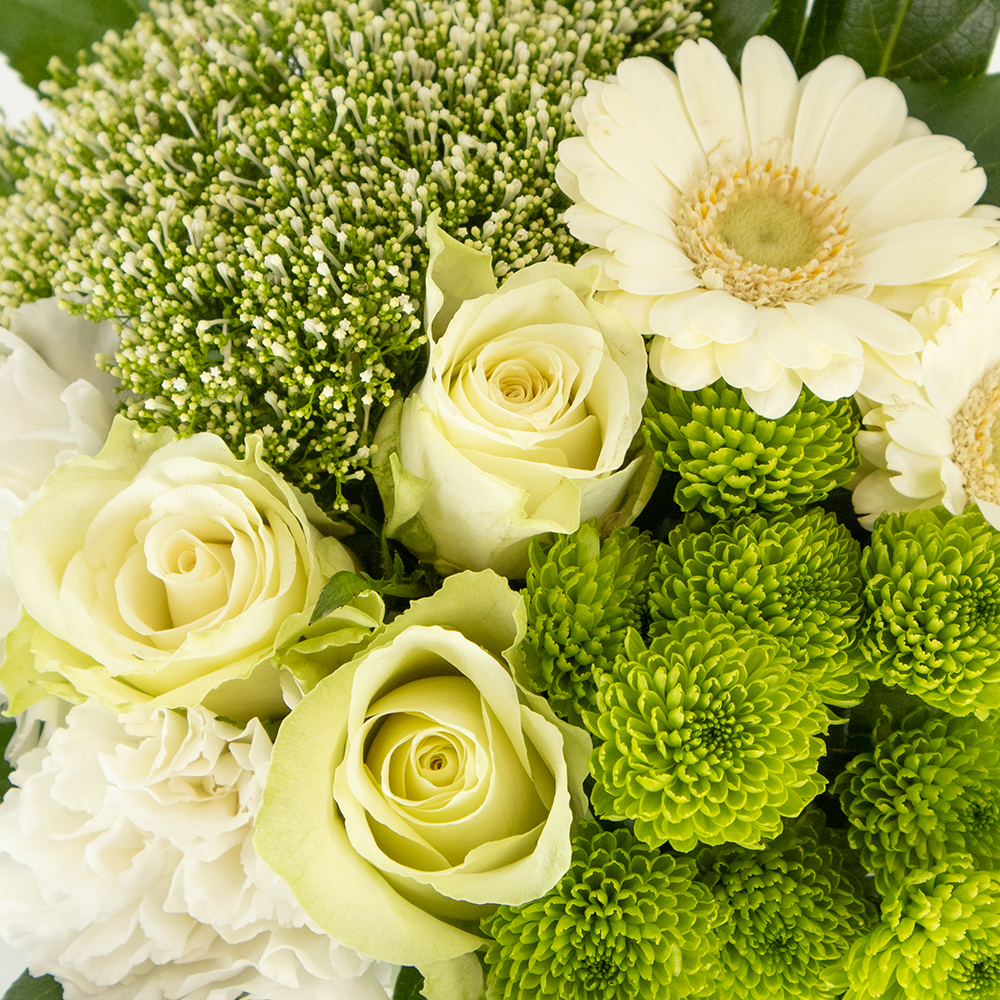 Elegant und schick – unser Blumenstrauß Ida mit gratis Glasvase Wir haben den perfekten Blumenstrauß für dich! Er besteht aus wunderschönen weißen und grünen Blüten, darunter Gerbera, Rosen, Nelken und Allium. Unser Blumenstrauß Ida ist einfach elegant und wird in jeder Umgebung eine großartige Figur machen. Aber das ist noch nicht alles! Mit zu diesem Blumenstrauß bekommst du auch eine gratis Glasvase dazu, um den Strauß perfekt in Szene zu setzen. So musst du dir keine Sorgen machen, ob du eine passende Vase daheim hast. Egal, ob du jemandem eine Freude machen oder einfach nur dein eigenes Zuhause verschönern möchtest – dieser Strauß wird auf jeden Fall für Begeisterung sorgen. Also worauf wartest du noch? Bestell ihn dir gleich jetzt! Die gratis Glasvase kann vom Beispielfoto abweichen.