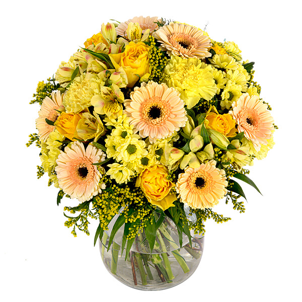 Prächtiger Blumengruß mit gelben und cremefarbenen Blumen wie z. B. Rosen und Germini von Hand floristisch mit Schnittgrün rund gebunden. Hinweis: Die abgebildete Vase ist nicht im Lieferumfang enthalten. Bitte beachte dass der Blumenstrauß von der Abbildung abweichen kann. Auch die Menge der Blüten weicht von der Abbildung ab. Das liegt daran dass jeder örtliche Florist individuell andere Einkaufsquellen durch seine Großhändler nutzt und somit die Mengen und Größen der Blüten abweichen können. Du kannst versichert sein dass immer dem Wert entsprechende Blumen in Blütengröße und Anzahl der Blumen verwendet wird.Lieferung im Laufe des Tages (ca. 09:00-19:00 Uhr). Einen unverbindlichen Wunschzeitraum kannst Du im Feld ?Adresszusatz? der Empfänger-Adresse eintragen. Hersteller:FloraPrima GmbHDidderser Str. 2838176 Wendeburginfo@floraprima.de