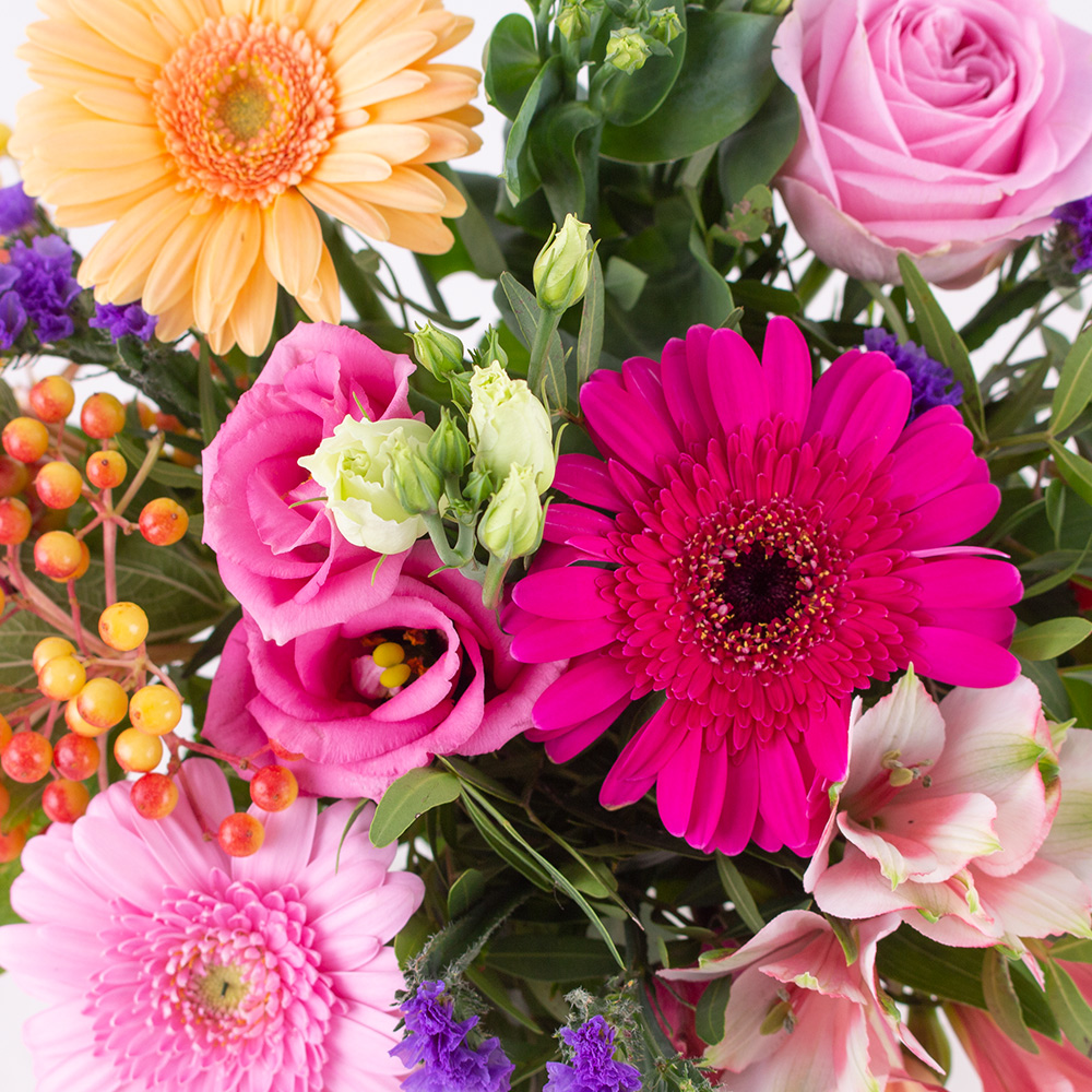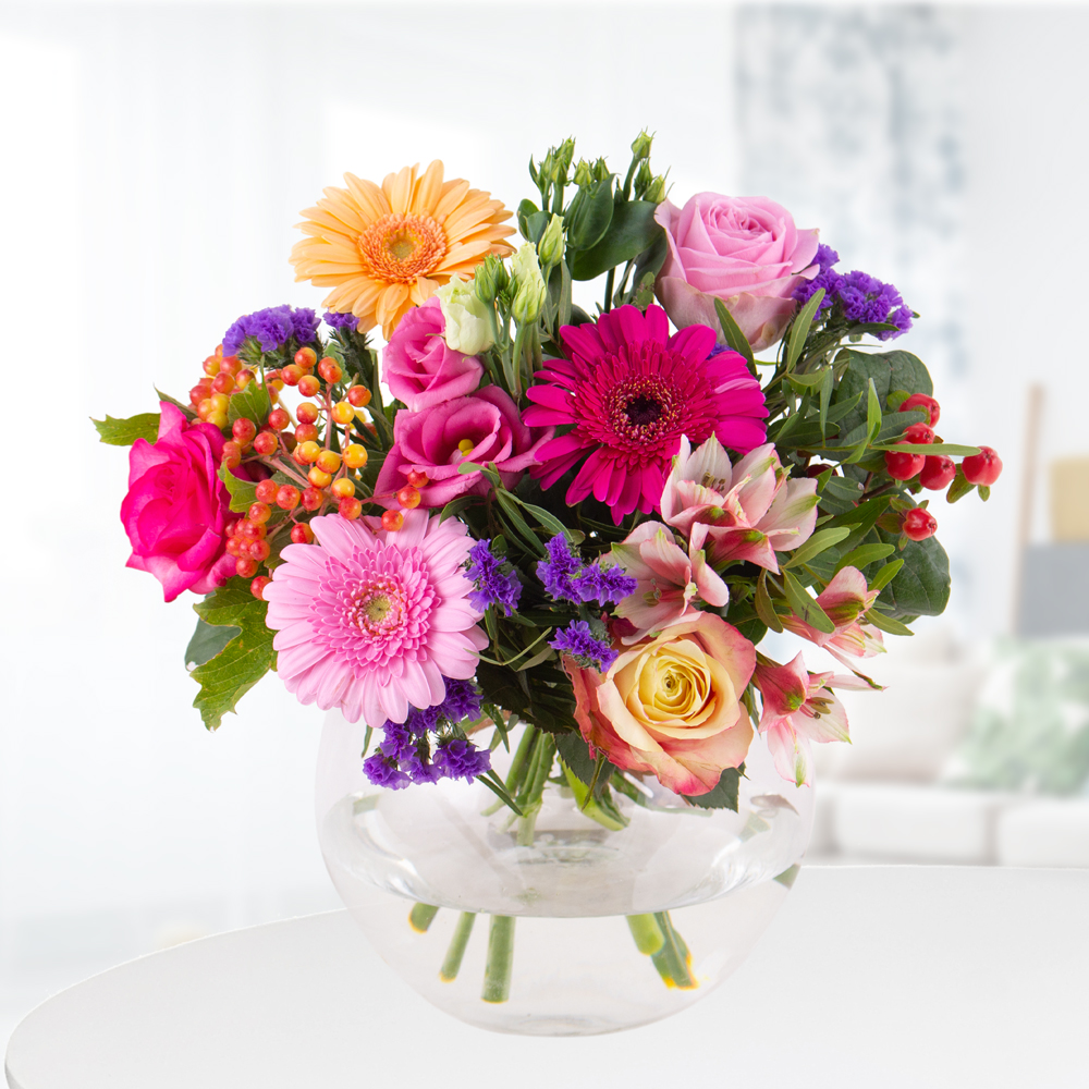 Kleines Glück in vielen Farben Der Blumenstrauß Kunterbunt ist die ideale Geschenkidee für jeden Anlass. Der Blumenstrauß eignet sich hervorragend als Geschenk zum Geburtstag, als Genesungsgruß oder um sich bei lieben Menschen zu bedanken. Inkalilien, rosa Gerbera, farbenfrohe Rosen, traumhafte Lisianthus und Strandflieder machen den Blumenstrauß zu einem farbenfrohen Highlight. Mit unserer kostenlosen Grußkarte wird er zu einem wunderschönen Überraschungsgeschenk für jeden Anlass. Der bunte Blumenstrauß wird mit viel Liebe gebunden und ist ein wunderschöner Hingucker in jedem Wohnraum.