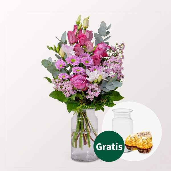Umwerfender Blumenstrauß mit rosa Lisianthus pinken Rosen Deep Purple rosa Freesien rosa Wachsblumen rosa Santini Bupleurum Eukalyptus und Salal. Durchmesser ca. 25 cm. Frisch für Dich zusammengestellt mit Pflegetipps Blumennahrung und Wasser versorgt.Hinweis: Die Freesien kommen im frischen und unaufgeblühten Zustand. Sie öffnen sich später je nach Standort und Temperatur. Hersteller:FloraPrima GmbHDidderser Str. 2838176 Wendeburginfo@floraprima.de