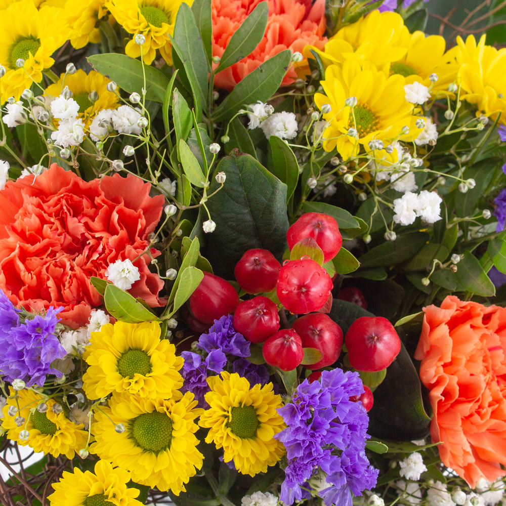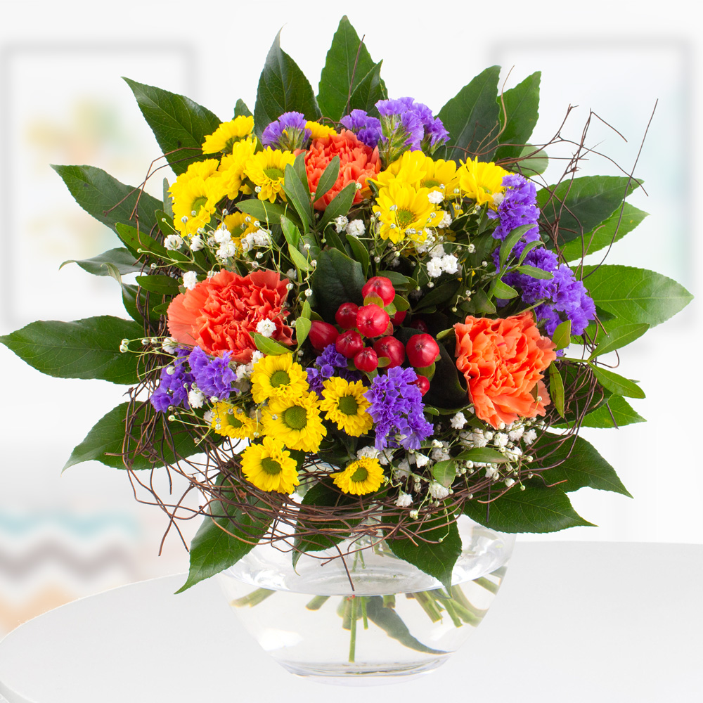 Bunte Vielfalt für jeden Anlass Du möchtest jemandem eine kleine Freude machen? Egal zu welchem Anlass? Ob Blumen zum Geburtstag, als Danksagung, zum Einzug, zur Hochzeit oder einfach nur so? Dann ist Louise die richtige Wahl für dich! Klassisch gebunden und mit einer strahlenden Farbpracht ausgestattet, wird unser Blumenstrauß Louise für leuchtende Augen sorgen, da sind wir uns ganz sicher. Bestehend aus Blumen wie orangenen Nelken, lila Strandflieder, gelben Chrysanthemen, Beeren und Schleierkraut bietet Louise eine bunte Vielfalt, die jeden Raum erhellt und alle Blicke auf sich ziehen wird. Sorge noch heute für Freude mit unserem klassisch gebundenem Blumenstrauß Louise. Denn Blumen zu verschenken ist eine Herzensangelegenheit. Blumen werden mit Freude entgegengenommen, ganz sicher! Denn war dir bewusst, das der Anblick von bunten Blumen unsere Stimmung hebt? Das ist tatsächlich wissenschaftlich bestätigt. Und nun leg‘ los: Wen möchtest du mit einem frischen Blumenstrauß glücklich machen?