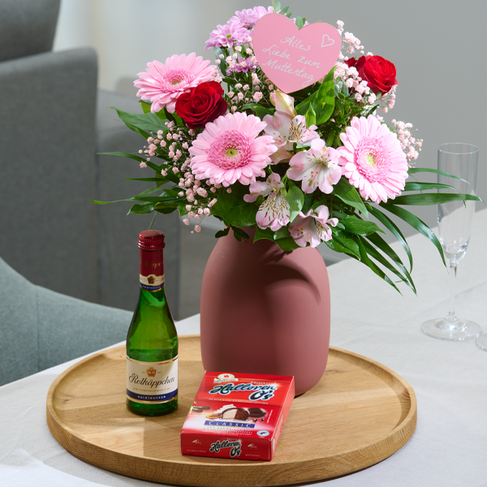 Großartiger Muttertags-Strauß mit roten Rosen rosa Germini rosa Schleierkraut rosa Alstroemeria rosa Santini Stecker ?Alles Liebe zum Muttertag? Chico Jumbo Pistochia und Salal. Durchmesser ca. 30 cm. Frisch für Dich zusammengestellt mit Pflegetipps Blumennahrung und Wasser versorgt. Hersteller:FloraPrima GmbHDidderser Str. 2838176 Wendeburginfo@floraprima.de