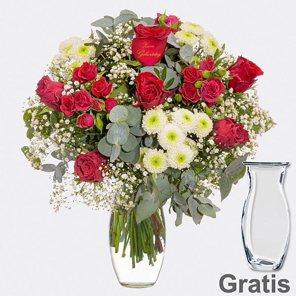 Umwerfender Blumenstrauß mit roter Rose mit Golddruck ?Zum Geburtstag? roten Rosen roten Sprayrosen weißem Schleierkraut weißen Santiniballs Eukalyptus und Pistochia. Durchmesser ca. 40 cm. Frisch für Dich zusammengestellt mit Pflegetipps Blumennahrung und Wasser versorgt. Hersteller:FloraPrima GmbHDidderser Str. 2838176 Wendeburginfo@floraprima.de