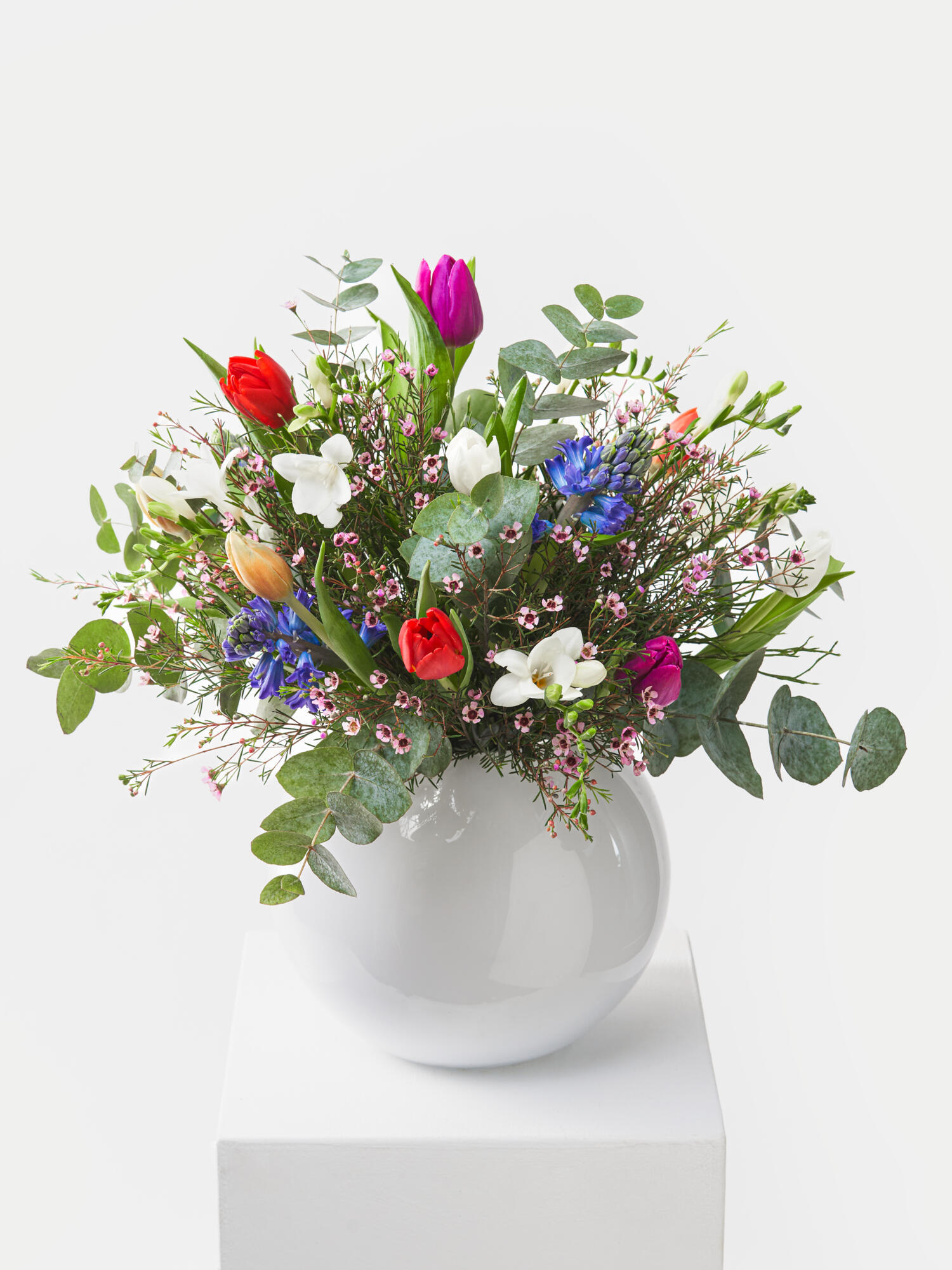Farbenfroher, aufgelockerter Strauß bestehend aus blauen, leicht duftenden Hyazinthen, weißen Freesien, rosa Waxflower und bunten Tulpen. Als Beiwerk werden Eukalyptus und Heidelbeere verwendet.