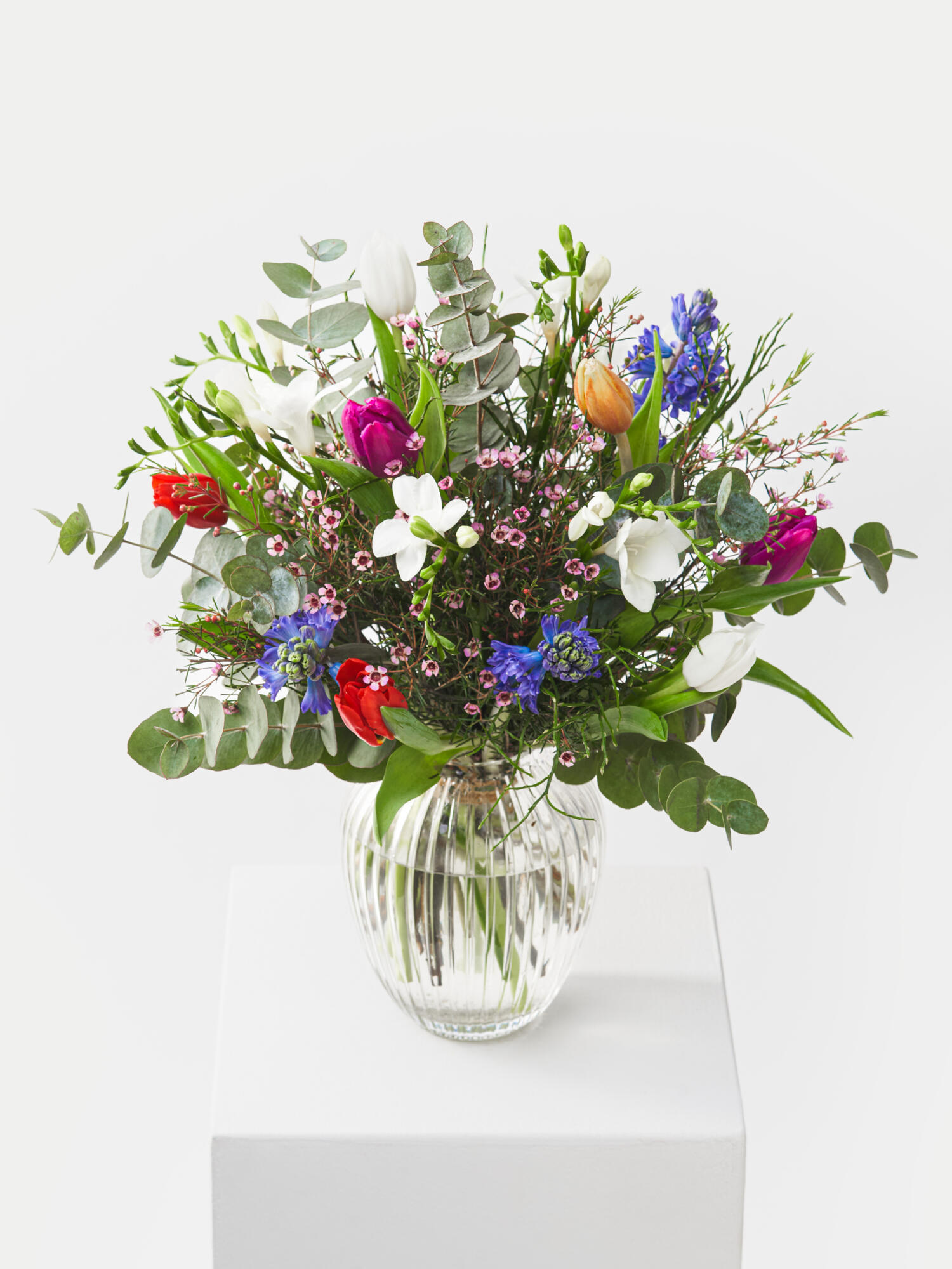 Farbenfroher, aufgelockerter Strauß bestehend aus blauen, leicht duftenden Hyazinthen, weißen Freesien, rosa Waxflower und bunten Tulpen. Als Beiwerk werden Eukalyptus und Heidelbeere verwendet.