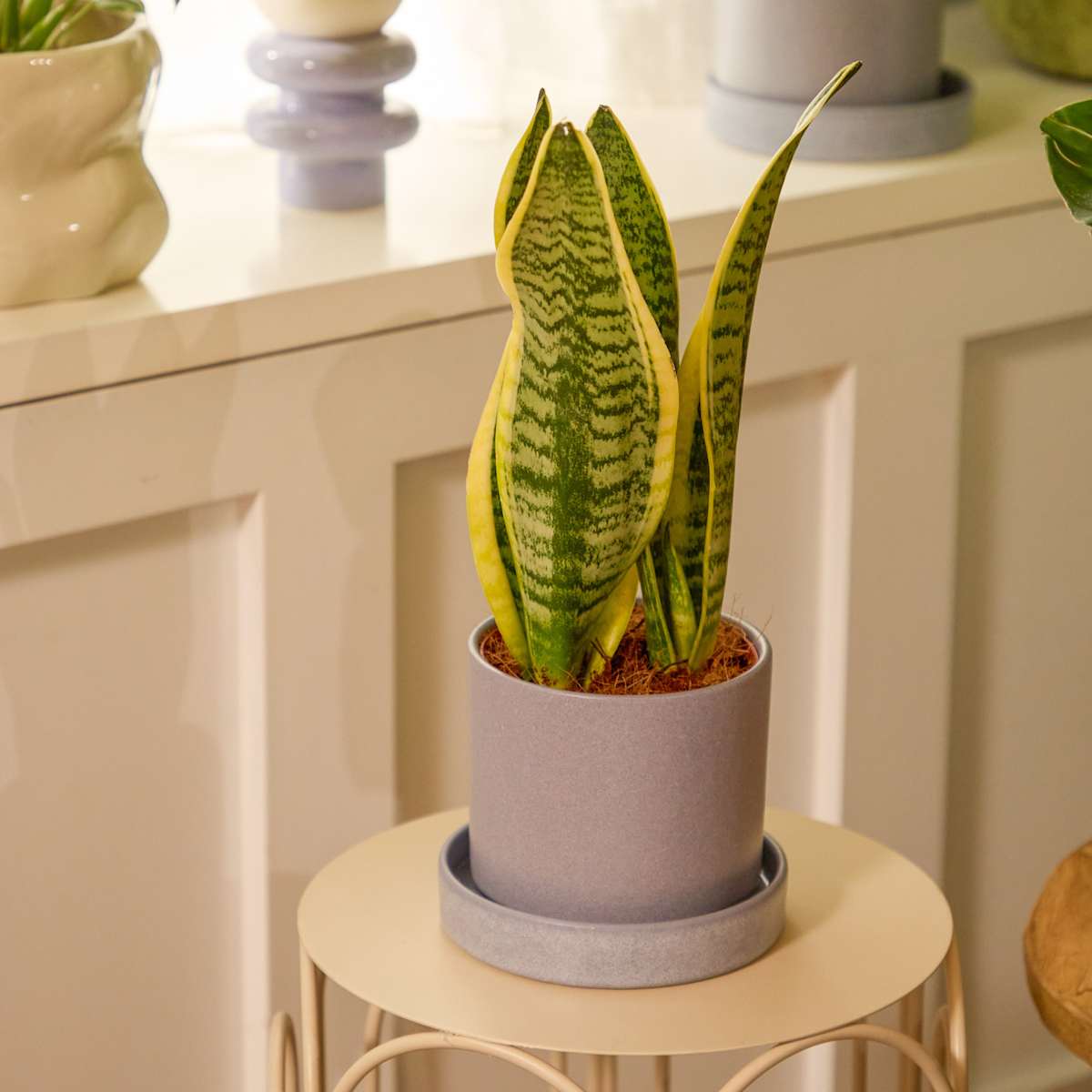 Der Bogenhanf ‚Superba‘ ist einfach super, das lässt sich nicht leugnen. Seine grün-gestreiften Blätter sind mit ihrem gelben Rand ein Eyecatcher, der sich sogar noch richtig nützlich macht. Sie sind in der Lage die Raumluft zu reinigen und Schadstoffe aus ihr zu filtern – echt super! Und auch sonst ist dieser Vertreter der Art Sansevieria trifasciata ein richtig super Exemplar. Mit seinem aufrechten Wuchs bringt er es immerhin auf bis zu 40 cm Breite. Der Bogenhanf ‚Superba‘ findet es super, wenn du ihn regelmäßig gießt, sodass die Erde immer leicht feucht ist. Dann belohnt er dich mit kräftigem Wuchs. Am besten kann er das an einem hellen Standort. Die pralle Sonne mag er nicht so gerne und auch Zugluft findet er nicht schön.