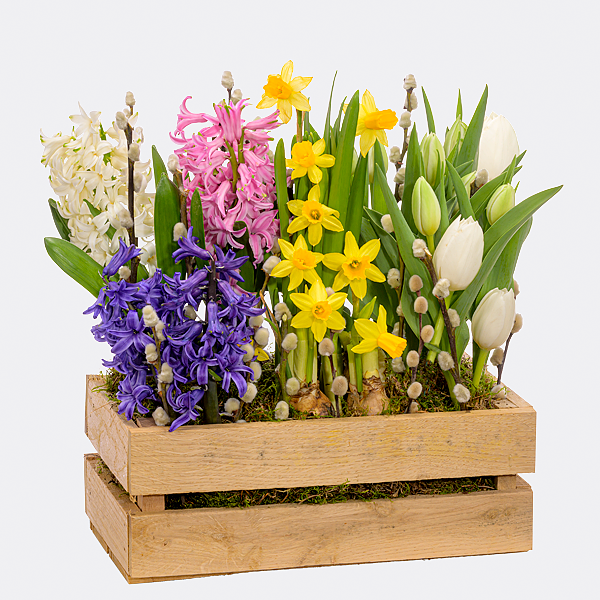 Bunte Vielfalt an Frühlingsblühern: Hyazinthen-Mix (Blau Rosa und Weiß) Tulpen und Narzissen mit Moos abgedeckt in einem modernen Holzkasten aus massivem Holz. Größe des Kasten ist ca. 30 x 18 x 14 cm.Hinweis: Das Set besteht aus einzelnen Teilen die lediglich in die Holzbox eingefügt werden müssen. Bitte beachte dass die Lieferung teilweise mit geschlossenen Blüten erfolgt.Hersteller:FloraPrima GmbHDidderser Str. 2838176 Wendeburginfo@floraprima.de