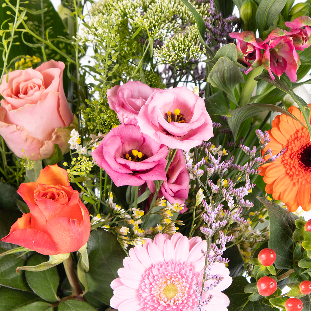 Bunter Blumenstrauß mit Milka Pralinés Bist du auf der Suche nach einem besonderen Geschenk, das garantiert ein Lächeln auf jedes Gesicht zaubert? Unser Kombiprodukt ist die ideale Wahl für jeden Anlass, denn der Empfänger erhält neben unserem Bunten Feldblumenstrauß auch leckere Milka Pralinés mit der Aufschrift „Von Herzen“. Unser Bunter Feldblumenstrauß vereint die schönsten Blüten in einem wunderschönen Mix aus warmen Farben. Neben Rosen und Gerbera hält der Strauß für dich auch Lisianthus und Löwenmäulchen bereit. Ob im Wohnzimmer oder in der Küche, dieser fröhliche Feldblumenstrauß versprüht gute Laune pur. Dazu verschenkst du mit diesem Kombiprodukt unwiderstehliche Milka Pralinés: Zartschmelzende Alpenmilch Schokolade gefüllt mit köstlicher Haselnusscrème. Diese Pralinen sind ein Genuss für die Sinne und runden das Geschenk perfekt ab. Egal ob Geburtstag, Jubiläum oder einfach nur, um jemandem zu zeigen, wie gern du ihn hast – dieses Duo bringt Freude und Genuss auf einmalige Weise zusammen. Jetzt bestellen und Freude schenken! Lieferumfang: * Bunter Feldblumenstrauß Large (https://www.blumenshop.de/bunter-feldblumenstrauss.html) * Milka Pralinés – I love Milka (https://www.blumenshop.de/milka-pralines-i-love-milka.html)