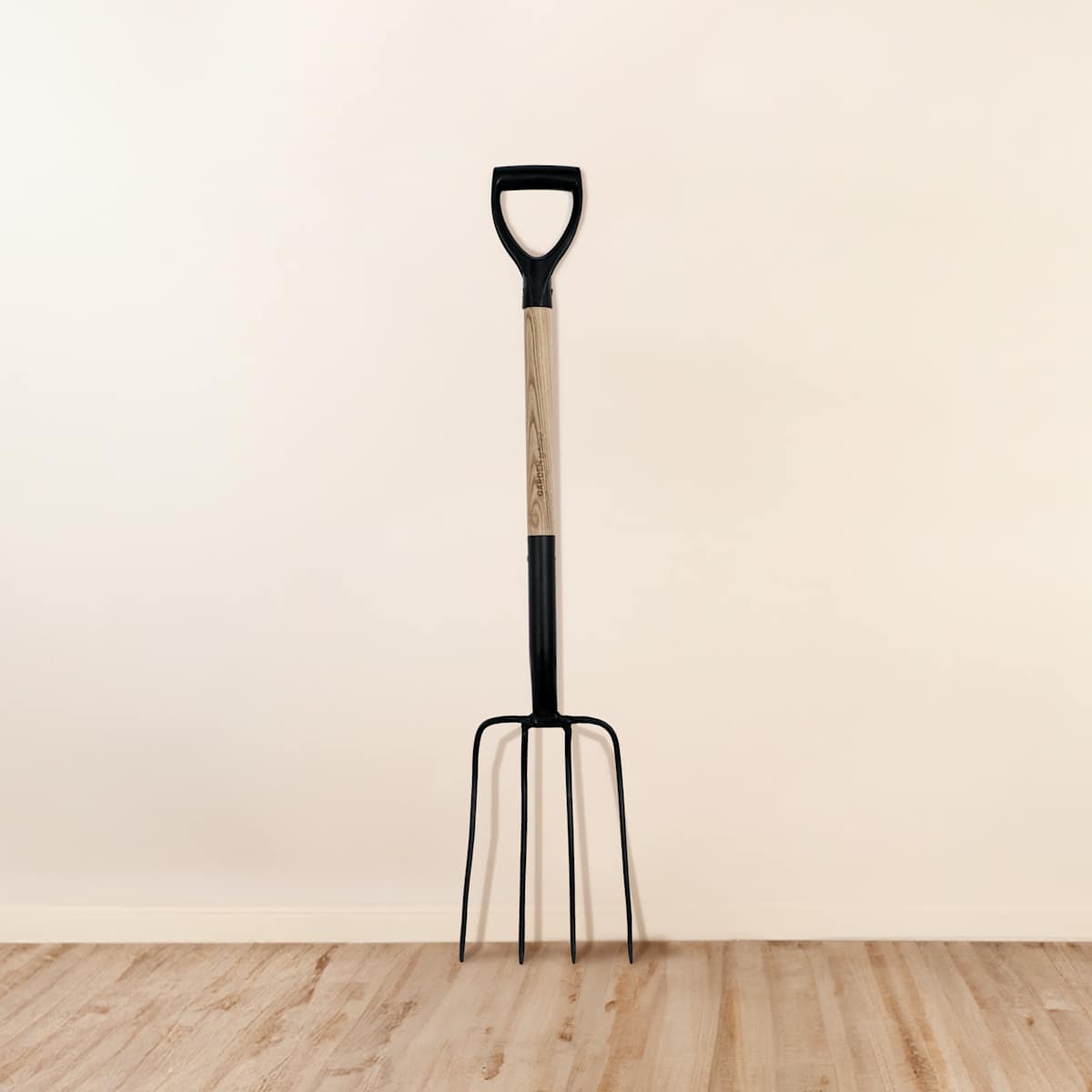 Grabgabel Deluxe. Stabile Gabel mit vier Krallen aus mattschwarzem Stahl. Holzgriff aus grauer Esche. Das Eschenholz wird aufgrund seiner Haltbarkeit, der schönen Alterung und des relativ leichten Materials sorgfältig ausgewählt. Länge: 1 m, Gewicht: 1,3 kg, Stahlkopf: 21 x 5 x 33 cm.