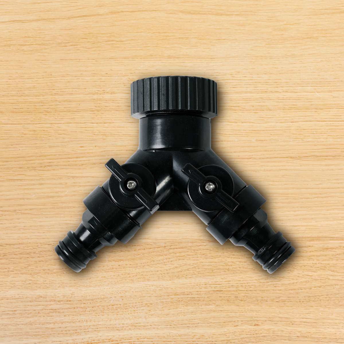 Zwei-Wege-Ventil aus hochwertigem Material. 6,5 cm. Beide Auslässe sind voll einstellbar. Anschluss 1/2″ und 3/4″.