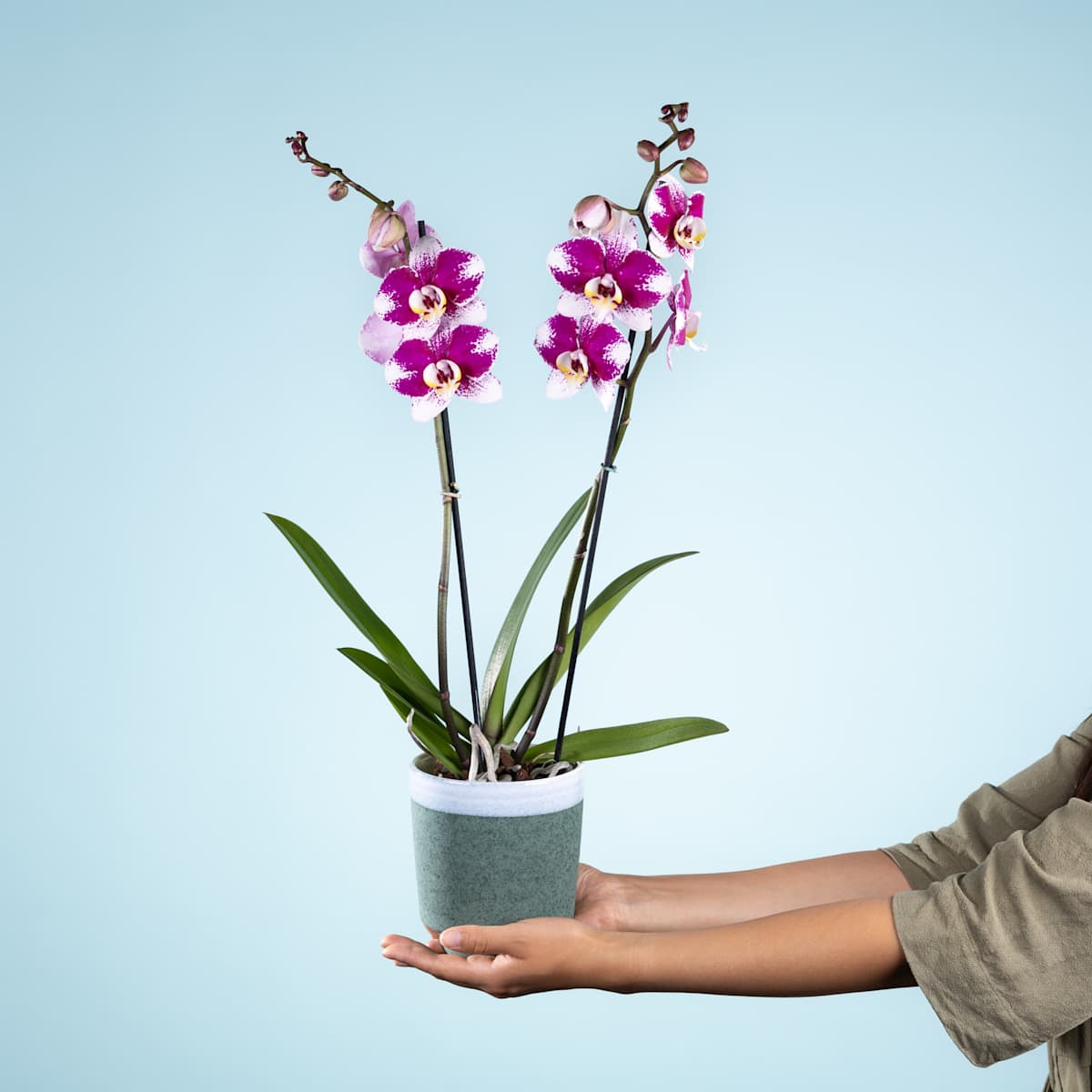 Du bist auf der Suche nach der perfekten Aufmerksamkeit, um deinem Lieblingsmenschen eine besondere Freude zu bereiten? Dann ist unsere hübsche Orchidee Cherry Glow genau das Richtige für dich. Sie hat eine Wuchshöhe von ca. 60 cm und befindet sich in einem dekorativen Übertopf. Ihre zweifarbigen Blüten in kräftigem Lila sitzen an langen Rispen und bilden einen schönen Kontrast zum dunklen Blattgrün. Die Phalaenopsis bevorzugt einen hellen bis halbschattigen Standort ohne direkte Sonneneinstrahlung. Zudem ist sie für eine hohe Luftfeuchtigkeit dankbar. Für die Bewässerung eignen sich wöchentliche Tauchbäder besonders gut. Fühlt sich die bezaubernde Tropenschönheit wohl, bleiben die Blüten über viele Wochen erhalten.