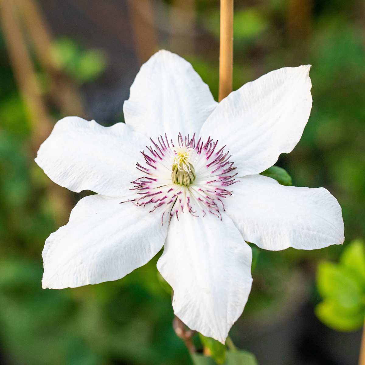Die Clematis ‚Miss Bateman‘ weiß, wie sie Akzente setzen kann. Von Mai bis August präsentiert sie ihre großen Blüten in strahlendem Weiß. Damit stiehlt sie jeder anderen Pflanze fast die Show. Aber eben auch nur fast, denn diese rankende Pflanze macht sich unter anderem auch sehr gut als Begleitung in Rosengärten. Mit ihren bis zu 3 m Wuchshöhe bei 1 m Breite kann Clematis Hybrid Clematis ‚Miss Bateman‘, wie sie sich botanisch nennt, aber auch an Pergolen oder Spalieren klettern. Mit entsprechender Rankhilfe macht sie sogar als Kübelpflanze eine gute Figur. Hauptsache du gibst ihr einen sonnigen bis halbschattigen Standort und immer genug Wasser, dann ist diese Waldrebe schon zufrieden und wächst munter drauf los.