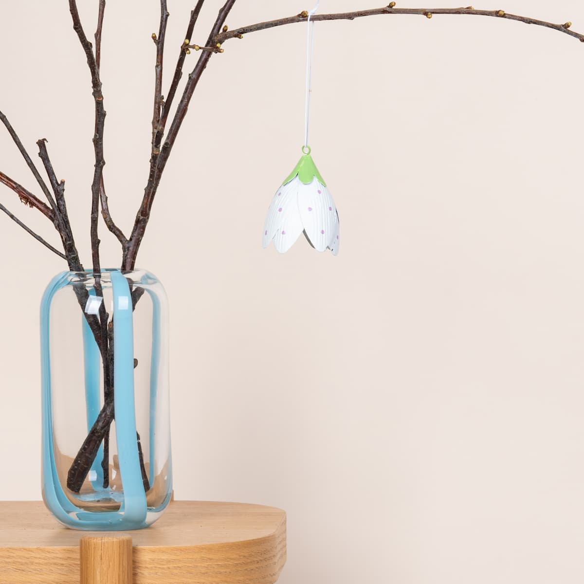 Endlich Frühling und höchste Zeit, den Osterstrauß zu arrangieren. Wir haben für dich eine hübsche Abwechslung zum klassischen Osterei. Unser „Metall Hänger Flower Weiß“ ist mit matter Farbe lackiert und wird von kleinen Punkten geschmückt. Die glockenförmige Blüte hat eine Höhe von 8 cm. Die Blütenöffnung auf der Unterseite beträgt 7 cm. Für die Befestigung an einem Zweig ist der Osterhänger bereits mit einem 10 cm langen Baumwollband ausgestattet. Mal ehrlich, der hübsche Hänger aus Metall ist auch nach Ostern noch eine tolle Dekoration. Du kannst ihn zum Beispiel an die Zweige deiner Sträucher hängen. Dir fallen sicher noch viele weitere Ideen für eine Dekoration ein.