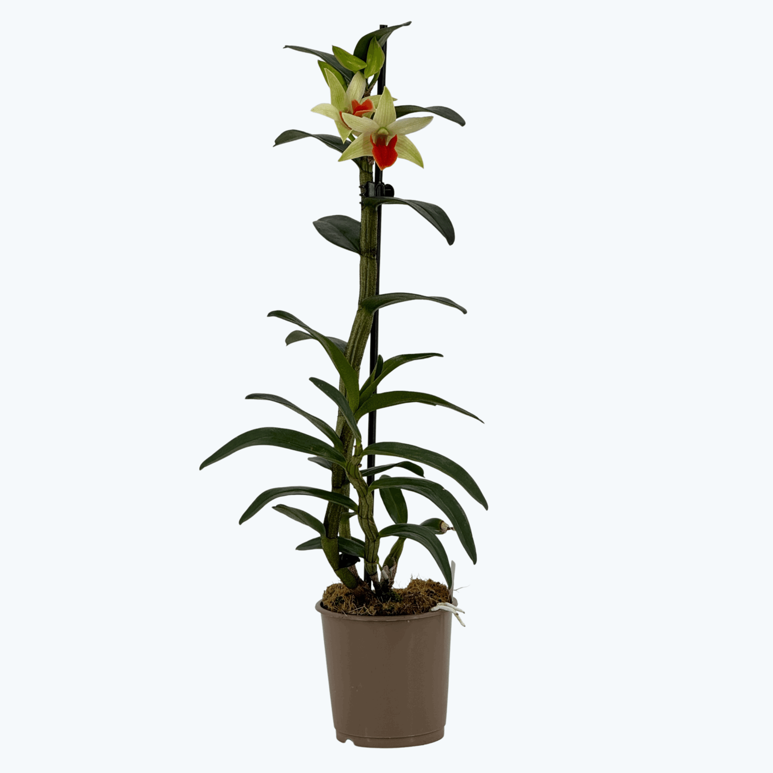 Dendrobium Frosty Dawn ist eine außergewöhnliche Orchidee mit attraktiven, dunkel ‚behaarten‘ Trieben und einer eleganten Wuchsform. Dieses Dendrobium hat eine aussergewöhnlich gute Haltbarkeit. Die Blüten sind grün-weiß mit einer intensiven orange-roten Lippe, was der Pflanze einen einzigartigen Farbakzent verleiht. Dendrobium Frosty Dawn eignet sich ideal für helle Standorte ohne direkte Mittagssonne. Dendrobium Frosty Dawn ist pflegeleicht, dekorativ und perfekt für Sammler sowie Liebhaber besonderer Dendrobium-Hybriden.