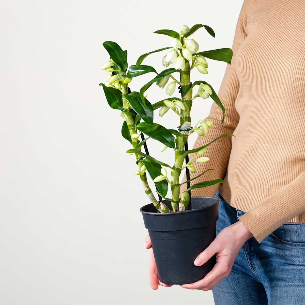 Die Dendrobium-Orchidee ‚Nobile Apollon‘ verleiht deiner Inneneinrichtung einen noblen Chic, oder ein Hauch Asia-Flair – ganz wie du möchtest. Mit ihren strahlend weißen Blüten und den an Bambus erinnernden Trieben und Blättern lässt sie sich auf diverse Arten stylen. Und mit ihrem aufrechten Wuchs, der sie bis zu 70 cm hoch und 50 cm breit werden lässt, ist diese Vertreterin der Art Dendrobium nobile auch schwer zu übersehen.Damit die Dendrobium-Orchidee ‚Nobile Apollon‘ auch wirklich alles mit macht, musst du drauf achten, dass sie an einem sonnigen bis halbschattigen Platz steht und es nicht zieht, das mag sie nämlich nicht. Natürlich sollte es regelmäßig auch etwas Wasser geben, aber nicht zu viel und besonders keine Staunässe. Ja, sie ist schon eine kleine Diva, aber bei den Talenten ist das doch wirklich Nebensache, oder?