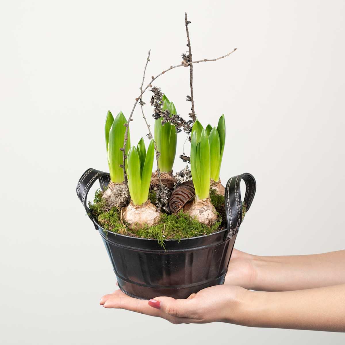 Du möchtest deine Liebsten zur Winterzeit mit einem blumigen Gruß überraschen? Dann schau dir doch mal unsere hübschen Hyazinthen Duftige Grüße an. Sobald sie ihre Blüten entfalten, sehen sie nicht nur schön aus, sondern verströmen auch einen betörenden Duft. Die Zwiebelblumen befinden sich in einem schwarzen Metalltopf und eignen sich gut für den Außenbereich. Natürlich können die beeindruckenden Frühblüher auch im Wohnraum platziert werden, doch besonders wohl fühlen sie sich draußen. Je wärmer die Blumen stehen, desto schneller öffnen sie ihre kleinen, glockenförmigen Blüten, die sich an einem kräftigen Stängel befinden. Nach der Blüte kannst du sie für das nächste Jahr direkt in den Außenbereich pflanzen.