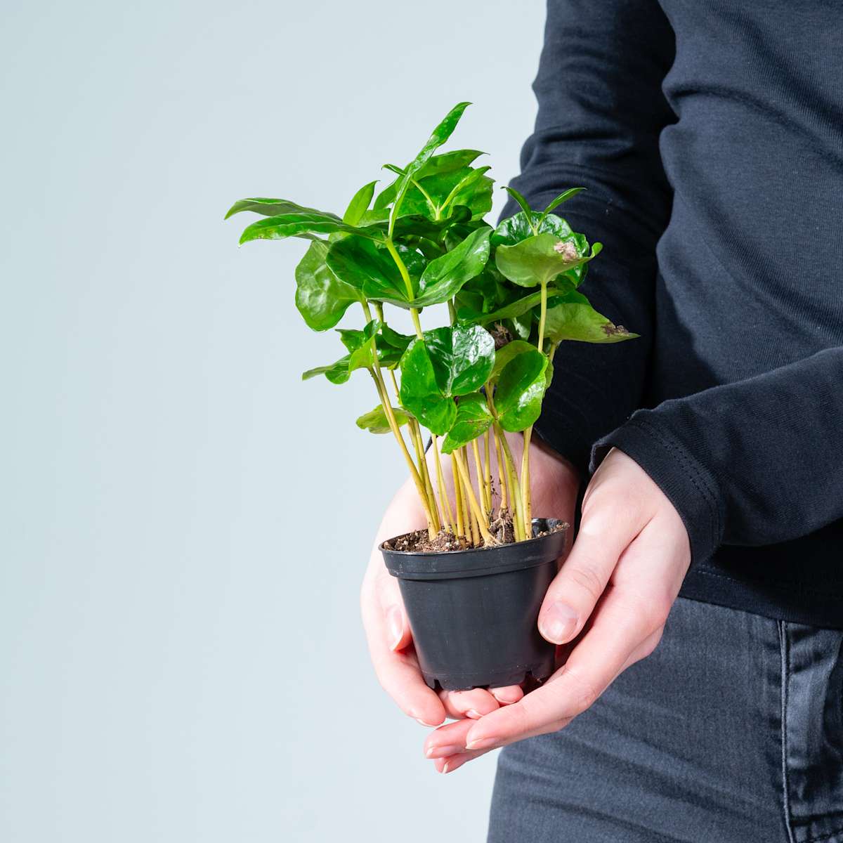 Selbst wenn du lieber Tee oder Kakao trinkst, wirst du begeistert sein von der Echten Kaffeepflanze! Klar, bei den herrlichen, glänzenden, dunkelgrünen Blättern verbreitet sie einen Hauch Exotik. Dabei ist Coffea arabica, wie sie botanisch genannt wird, von Hause aus eine strauchartige Pflanze, die das Potential mit sich bringt 2 m hoch und 1,2 m breit zu werden. Und du hast dann tatsächlich eine Mini-Kaffeeplantage bei dir zuhause, denn aus den duftenden, weißen Blüten, die sie von Juni bis August trägt, können auch hierzulande die bekannten roten Beeren entstehen, die die Kaffeebohnen enthalten. Du musst die Echten Kaffeepflanze regelmäßig gießen und sie an einen sonnigen bis halbschattigen Platz stellen. Gelegentliche Wassersprüher findet sie übrigens auch nett, besonders wenn die Luft sehr trocken ist. Die Sommer verbringt sie gerne draußen im Garten, auf der Terrasse oder dem Balkon. Sobald es runter geht mit den Temperaturen, möchte sie aber wieder rein.