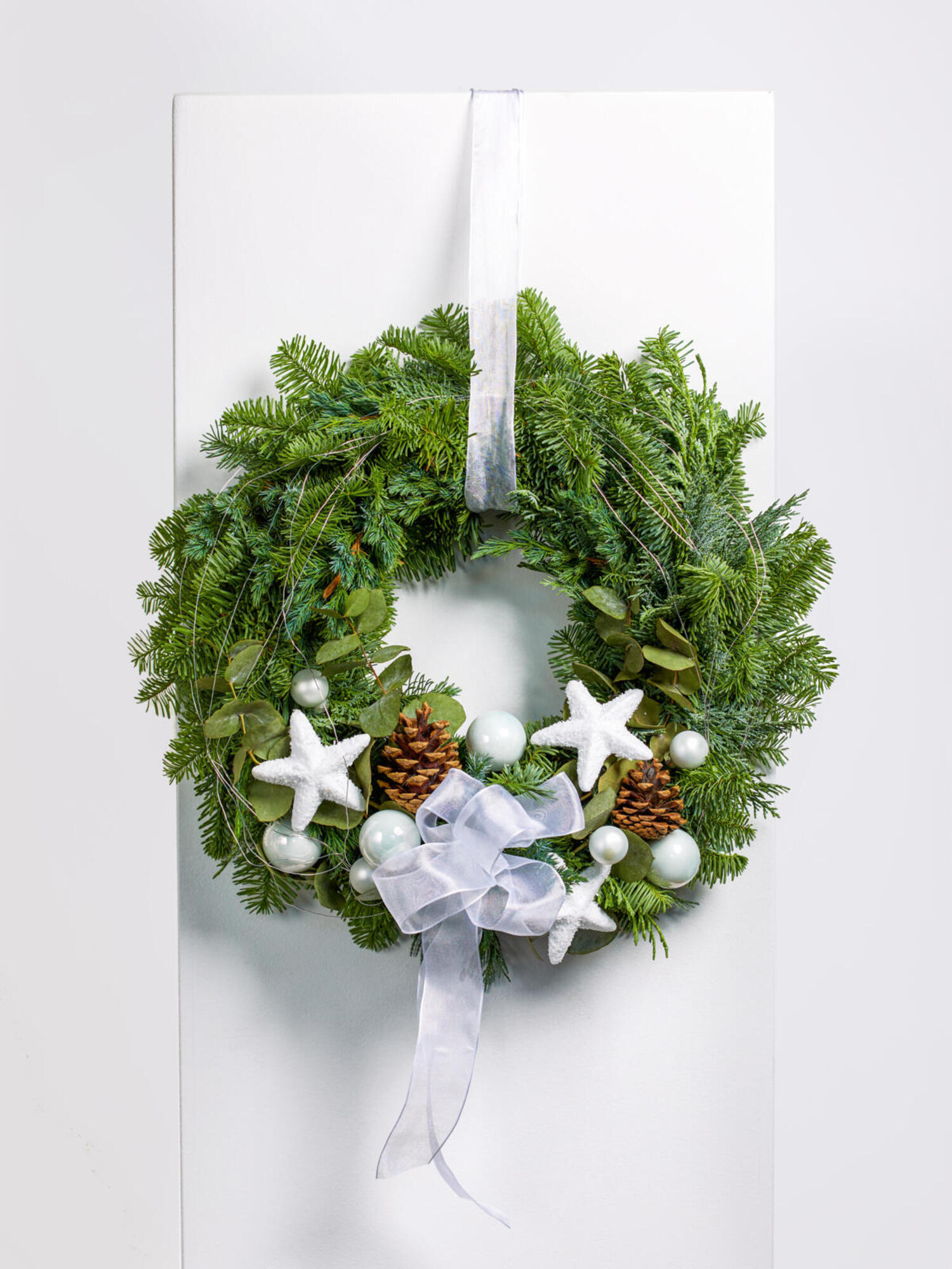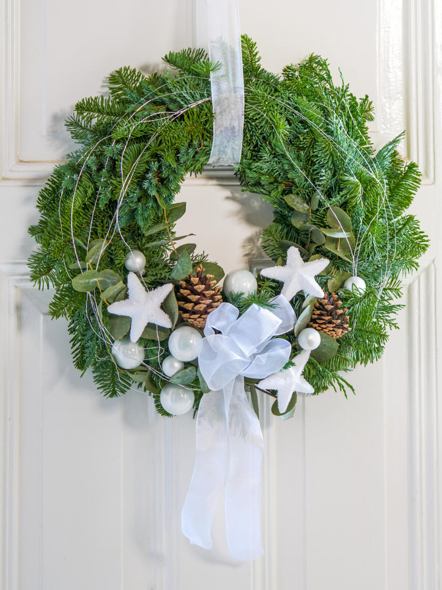 Weihnachts-Türkranz aus Konifere in Grün-Weiß mit weißem Schleifenband zur Aufhängung, Zapfen, Dekosternen, weißen Weihnachtskugeln aus Glas, Silberdraht und Eukalyptus. Außendurchmesser ca. 35 cm.