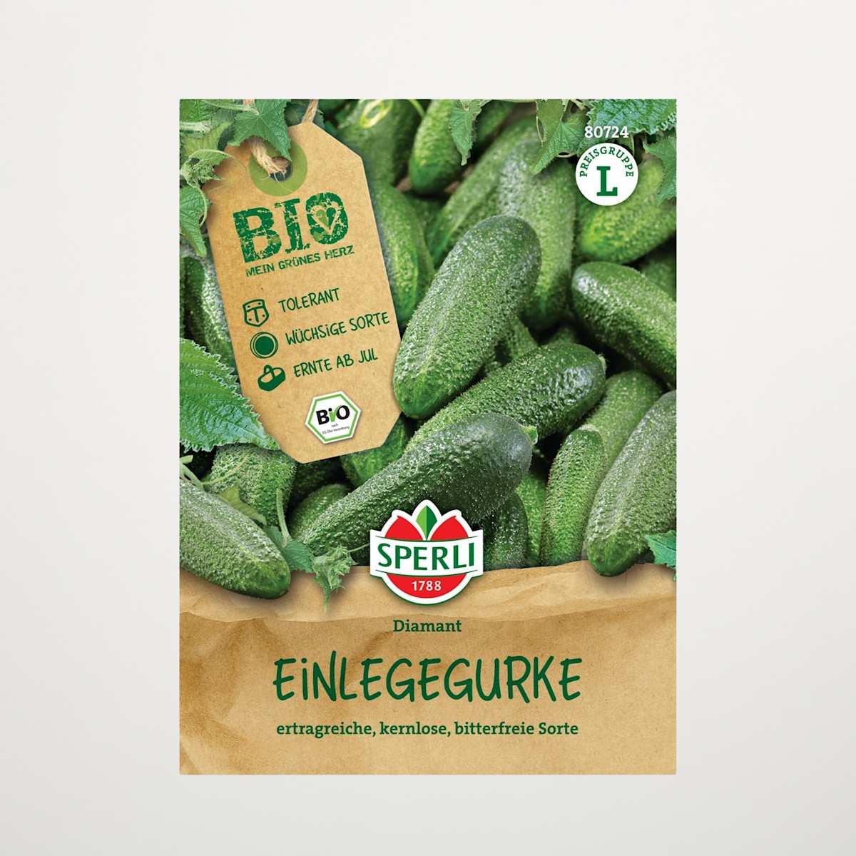 Wenn du dich schon immer mal gefragt hast, wie die Gurken ins Glas kommen, solltest du dir die BIO Einlegegurke ‚Diamant‘ F1 nicht entgehen lassen. Mit ihr kannst du es vom Samen an selbst miterleben. Ab April kannst du mit der Vorkultur beginnen, oder du säest ab Mai direkt draußen an Ort und Stelle, dafür kommen die Samen etwa 1 bis 2 cm tief in lockere Erde. Angießen nicht vergessen und du kannst zusehen, wie diese Vertreterin der Art Cucumis sativus anfängt zu wachsen. Mit ihrem rankenden Wuchs kann sie immerhin bis zu 1 m lang werden. Ab Juli kannst du dann die knackigen, kleinen, dunkelgrünen Früchte ernten. Und dann kannst du dir auch wirklich Gedanken machen, ob und wie du die Gürkchen ins Glas bekommst. In Essig einlegen, im Kräutersud einkochen, oder ganz trendy fermentieren – ganz was dir gefällt und schmeckt.