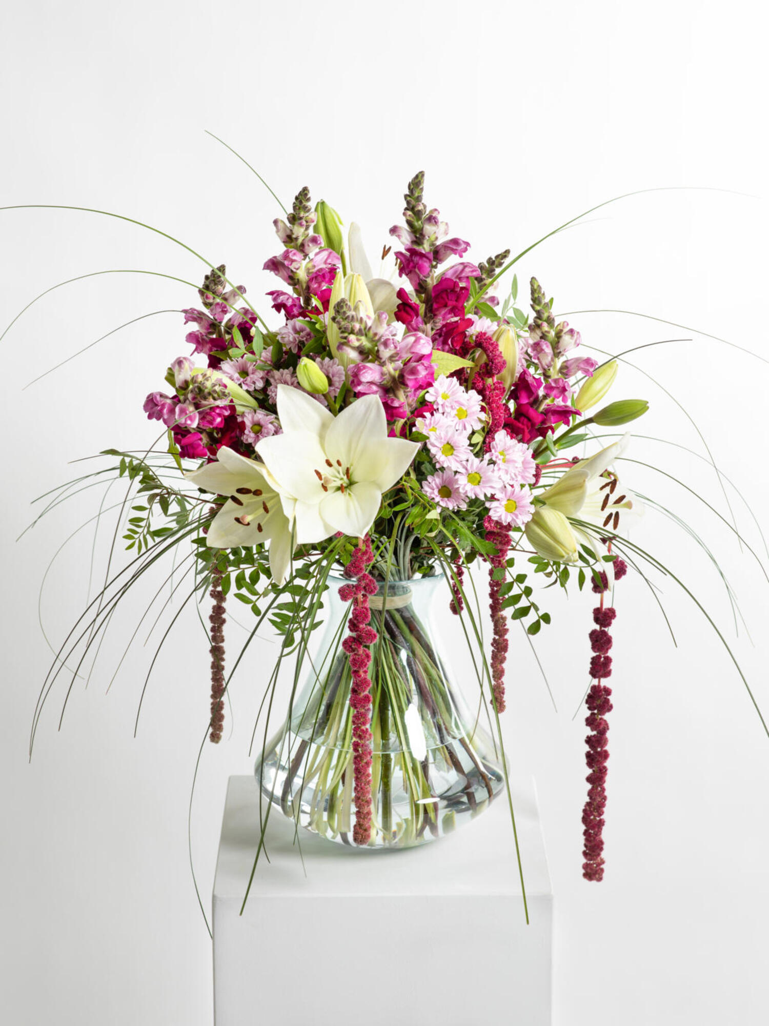 Mittellang gebundener Strauß in Weiß-Violett-Rosa-Rot mit Lilien, Santini, Löwenmaul und Amaranthus. Als Beiwerk werden Bärengras und Pistazie verwendet.